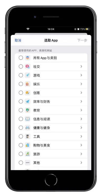 选择一个或多个 App 类别。 若要为单个 App 设定限额,请轻点类别名称以查看该类别中的所有 App,然后选择要设定限额的 App。如果选择了多个类别或 App,你设定的时间限额将应用到所有类别或 App。 -
