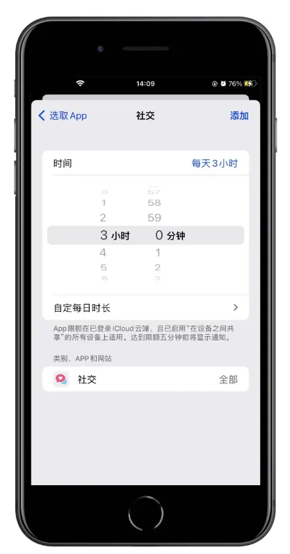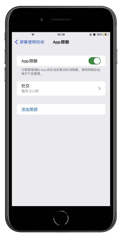可以为 App 类别(如“游戏”或“社交”或者“购物与美食”等)和单个 App 设定时间限额。