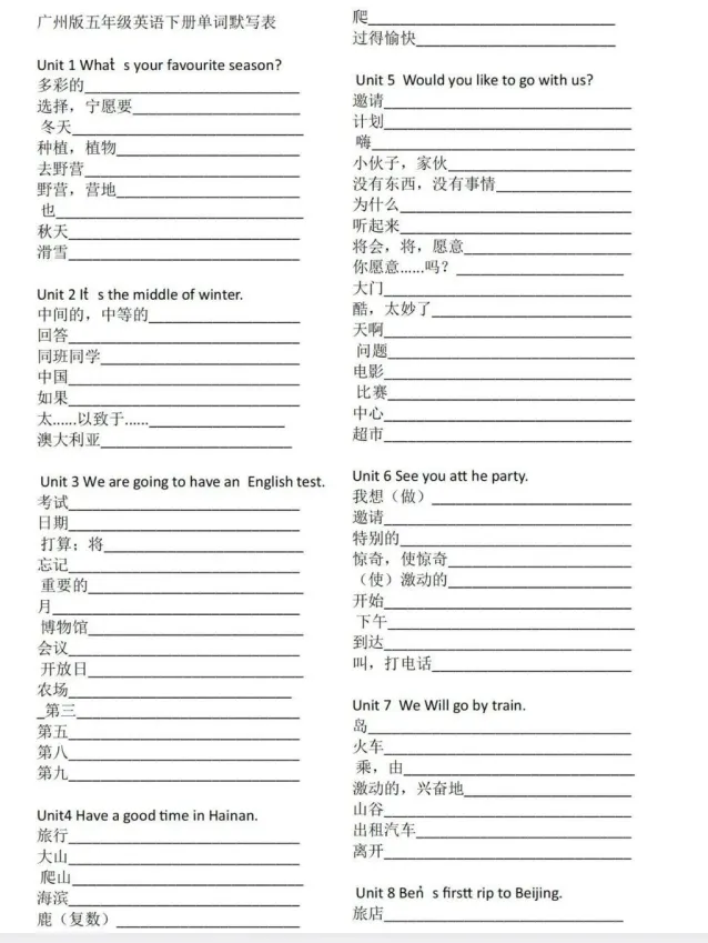 今天,给大家分享:2026春五年级下册广州教科版英语单词默写表!电子版!电子版!可下载打印!