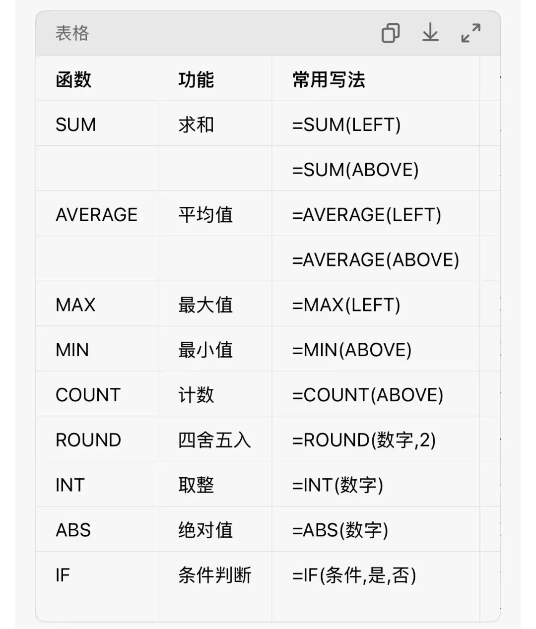 这里给你做一张干净、可直接复制到 Word 里使用的「Word 常用函数速查表」,格式整齐,打印也好看。