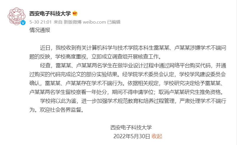 西安电子科技大学通报两学生毕设代做。经查,雷某某、卢某某两名学生在做毕业设计过程中通过网络平台购买代码,并通过购买的代码完成论文的部分实验结果。经学院学术委员会认定,学校学风建设委员会确认,雷某某、卢某某存在学术不端行为。依据相关规定,学校研究决定给予雷某某、卢某某两名学生留校察看一年处分,期间不得申请学位;取消卢某某研究生推免资格。(中国新闻网)