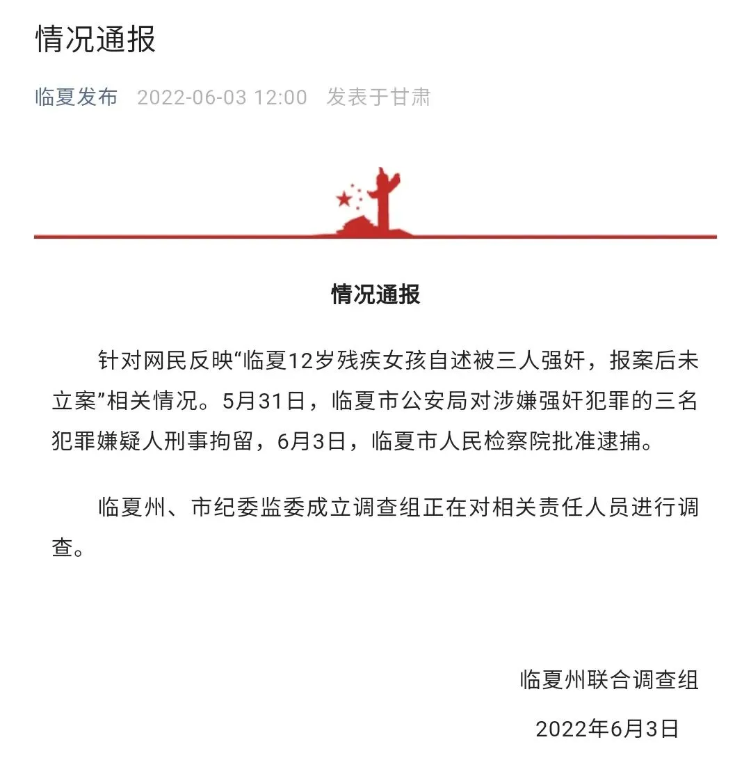 甘肃警方逮捕涉嫌强奸的三名犯罪嫌疑人。6月3日,针对网民反映“临夏12岁残疾女孩自述被三人强奸,报案后未立案”相关情况,临夏州联合调查组发布通告。5月31日,临夏市公安局对涉嫌强奸犯罪的三名犯罪嫌疑人刑事拘留,6月3日,临夏市人民检察院批准逮捕。(临夏发布)