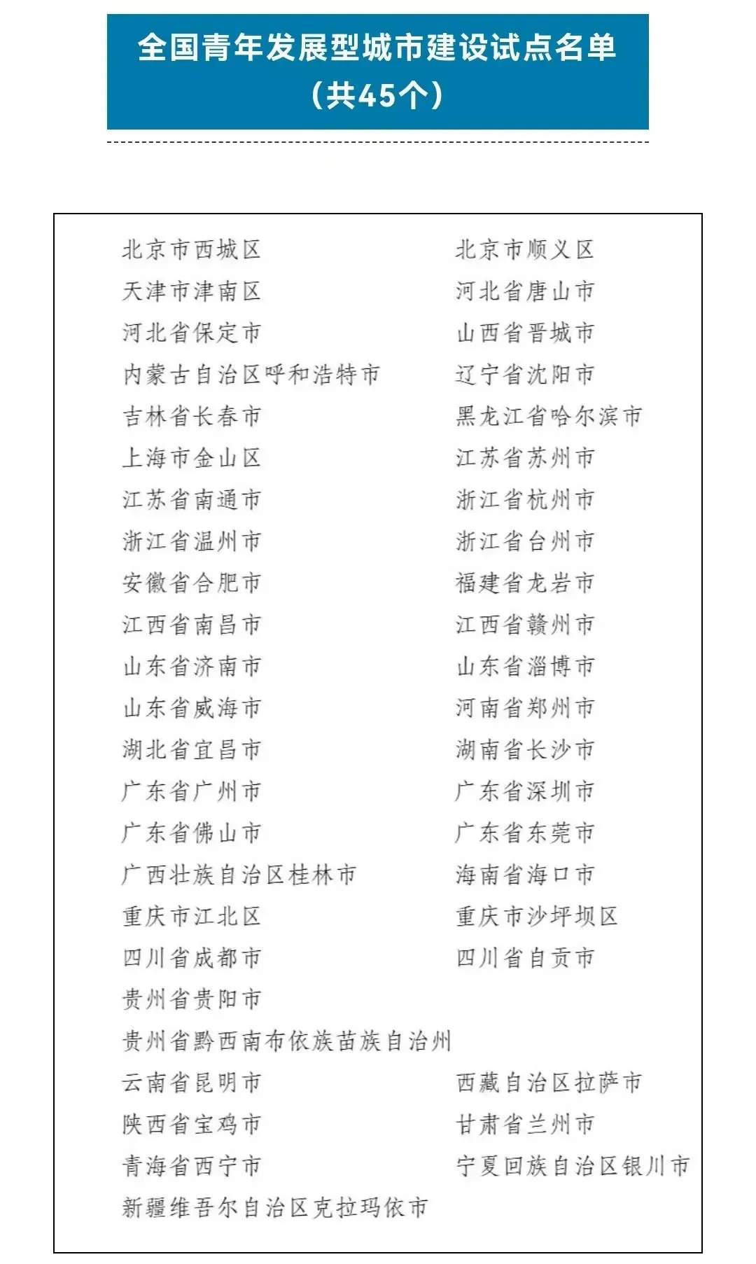 团中央:按照中央宣传部、国家发展改革委、共青团中央等17部门《关于开展青年发展型城市建设试点的意见》等文件部署,近日,中长期青年发展规划实施工作部际联席会议办公室对外公布全国青年发展型城市建设试点和青年发展型县域试点名单,其中,试点城市(含直辖市的市辖区)45个、试点县域99个。(查看更多)