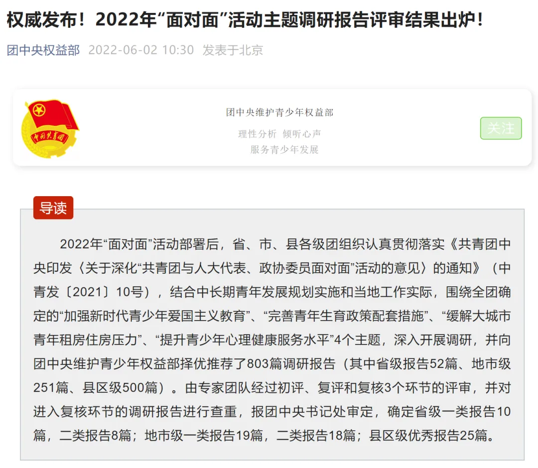 团中央:2022年“面对面”活动主题调研报告评审结果出炉!(查看更多)