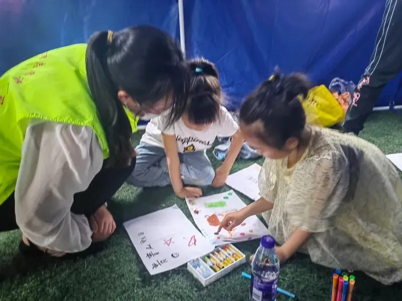 四川:6月2日,震后15小时,雅安芦山各级团组织迅速行动,组织青年志愿者在集中安置点开展志愿服务,“青青儿童乐园”已在芦山太平中学安置点、宝兴中学安置点开园。该乐园面向安置区少年儿童,提供有志愿者陪伴的安全玩耍场地;同时孩子们还会在专业志愿者的带领下,学习防灾减灾知识,尽快走出震后恐惧。(中国新闻网)