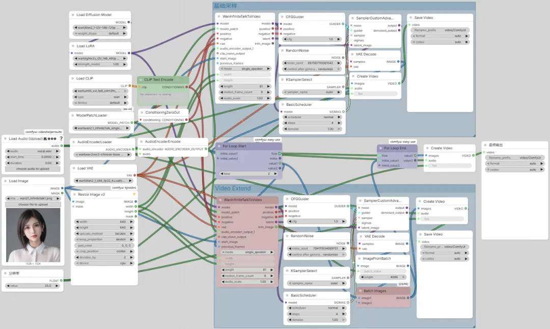 我们使用 for 循环简化官方版 InfiniteTalk 无限时长工作流。优化后的工作流如下: