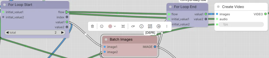 1. initial_value1:接收本次循环的输出值,并送入下一次循环的 initial_value1 中(即 For Loop Start的 initial_value1)。例如,将第一个视频扩展分组中的Batch Images的输出输入到该值,在第二个循环中,将该值输入给了For Loop Start的 initial_value1 -