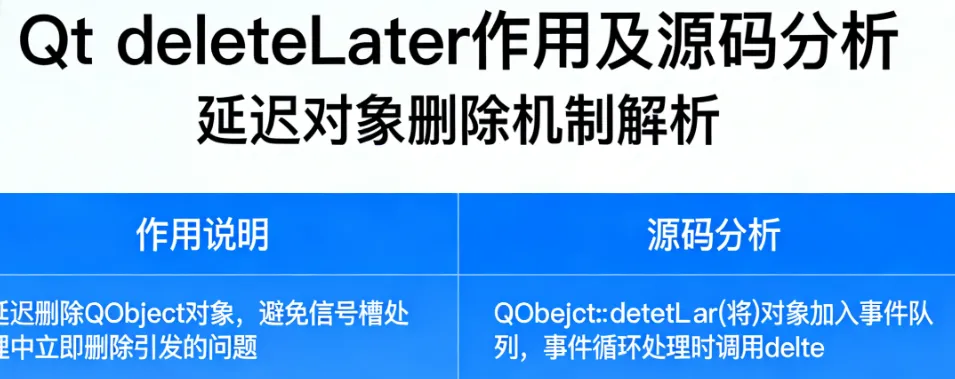 deleteLater() 是 Qt 提供的一个优雅的对象延迟删除机制。它利用事件循环的特性,将对象的销毁操作延后到安全的时间点,有效避免了悬空指针和资源访问冲突。通过源码分析,我们可以看到其背后依赖于 QCoreApplication::postEvent()、QDeferredDeleteEvent 以及 QObject::event() 的协同工作。理解这些内部原理,有助于我们更合理地使用 deleteLater(),写出健壮且高效的 Qt 程序。