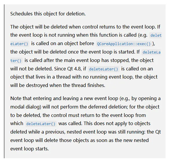 嵌套事件循环:打开模态对话框等操作会进入一个新的事件循环,但并不会导致已调度的删除立即执行;必须返回到最初调用 deleteLater()的那个事件循环,删除才会发生。不过,如果一个对象在旧的嵌套事件循环中已被调度删除,当新的事件循环启动时,这些对象会被立即删除。