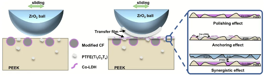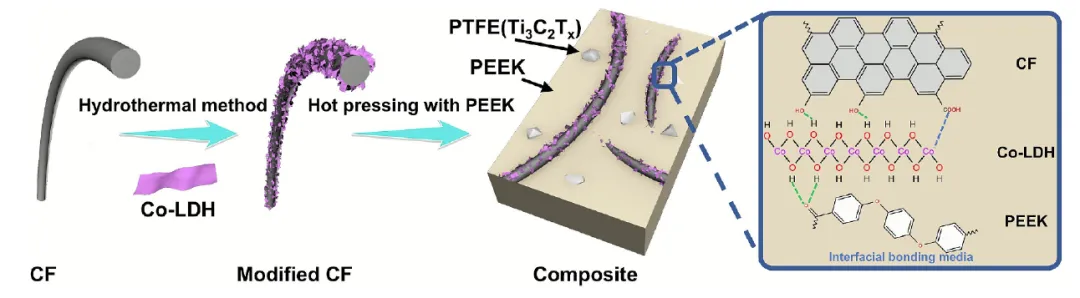 该研究通过水热法在碳纤维表面生长钴基层状双氢氧化物,并将其与PEEK-PTFE(Ti₃C₂Tₓ)基体复合,成功制备了PEEK(CF)-PTFE(Ti₃C₂Tₓ)复合材料。Co-LDHs在该复合材料体系中通过机械互锁和化学键合增强了碳纤维与PEEK基体之间的界面结合,从而显著提升了复合材料的力学性能;同时,Co-LDHs通过抛光效应、锚定效应以及与Ti₃C₂Tₓ和PTFE的协同效应,共同优化了复合材料的摩擦学性能,实现了高强度与优异自润滑/抗磨损性能的协同优化。