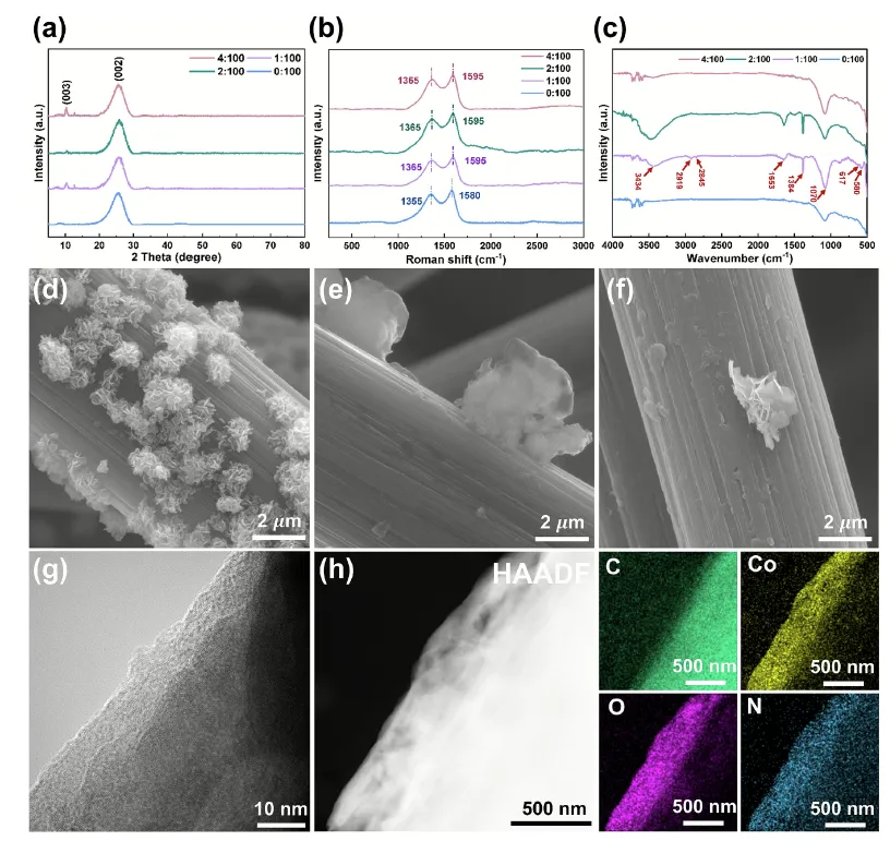 图2 (a) 改性碳纤维的XRD和(b)拉曼光谱,(c) FTIR光谱。 (d-f) 碳纤维的SEM形貌:(d) 1:100, (e) 2:100, (f) 4:100。 (g) 4:100碳纤维的HRTEM图像,(h) HAADF图像及EDS元素分布图