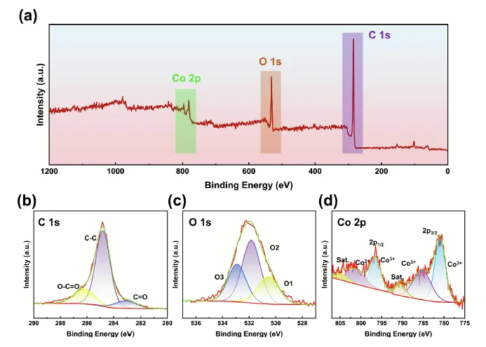 图3 (a) CF-LDH(1:100) 的XPS全谱,(b-d) CF-LDH 中元素的高分辨XPS谱图:(b) C 1s, (c) O 1s, (d) Co 2p.