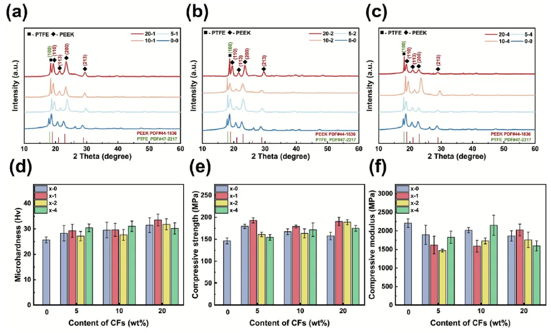 图4 (a-c) 含不同含量Co-LDHs纳米片改性碳纤维复合材料的XRD图谱:(a) 1:100, (b) 2:100, (c) 4:100。 (d) 复合材料显微硬度,(e) 压缩强度,(f) 压缩模量