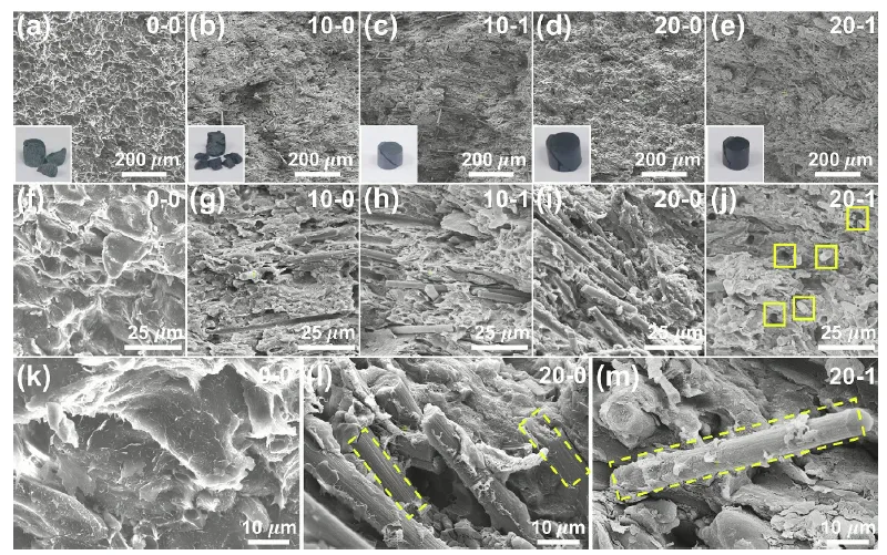 图5 (a-e) 五种复合材料断口形貌的低倍SEM图像及其宏观断口照片(插图):(a) 0–0, (b) 10–0, (c) 10–1, (d) 20–0, (e) 20–1。 (f-j) 复合材料断口形貌的高倍SEM图像:(f) 0–0, (g) 10–0, (h) 10–1, (i) 20–0, (j) 20–1。 (k-m) 断口表面暴露碳纤维边缘与表面的放大图像:(k) 0–0, (l) 20–0, (m) 20–1