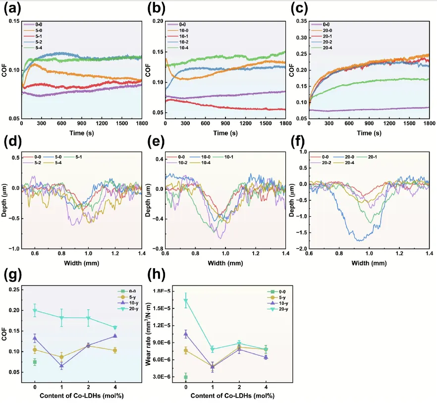 图6 (a-c) 不同碳纤维含量复合材料的典型摩擦系数-时间曲线:(a) 5-y, (b) 10-y, (c) 20-y。 (d-f) 不同碳纤维含量复合材料磨损轨迹横截面轮廓图:(d) 5-y, (e) 10-y, (f) 20-y。 (g) 复合材料平均摩擦系数汇总,(h) 复合材料平均磨损率汇总