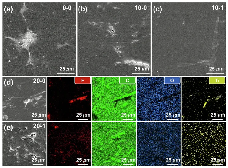 图8 (a) 0–0, (b) 10–0, (c) 10–1 复合材料磨损表面的SEM图像。 (d-e) (d) 20–0 与 (e) 20–1 复合材料的SEM图像及EDS元素分布图