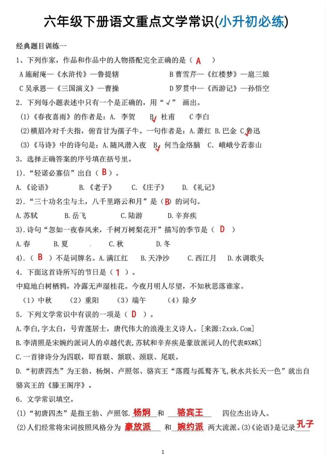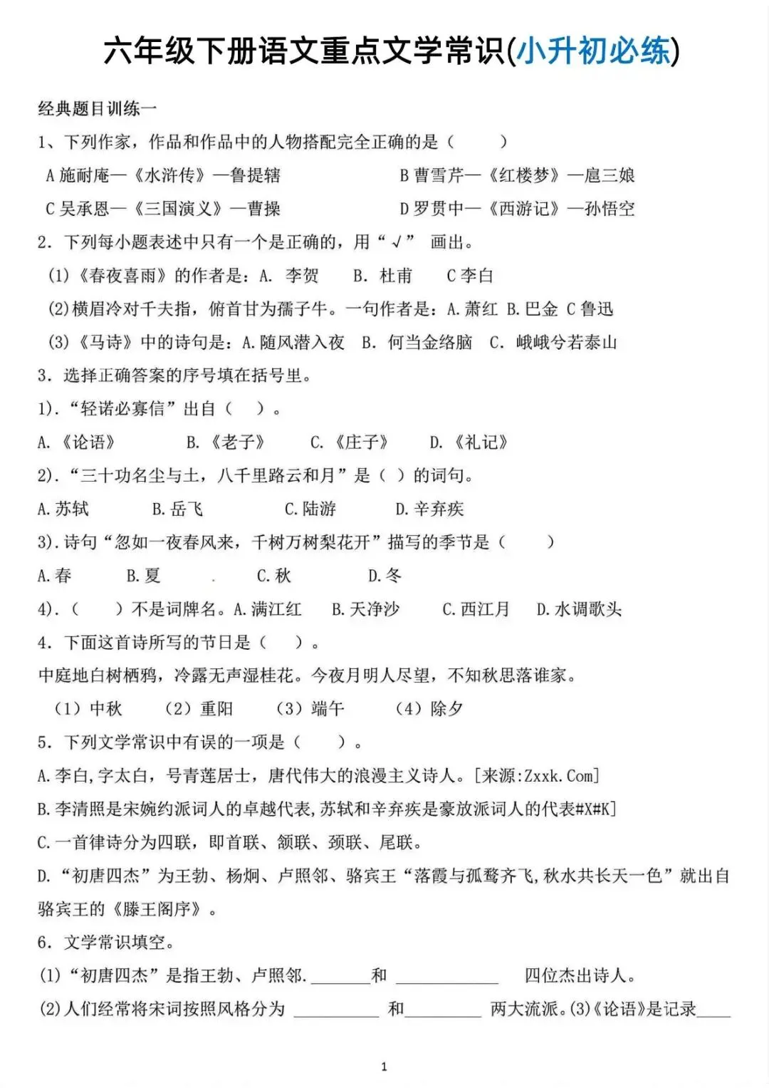 家有六年级孩子的家长们,小升初之战已经打响,语文文学常识是备考的关键一环!很多孩子在文学常识上丢分,影响总成绩。别担心,我们为大家整理了六年级下册语文重点文学常识,这可是小升初必备资料。
