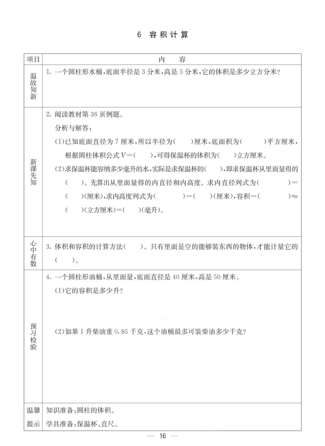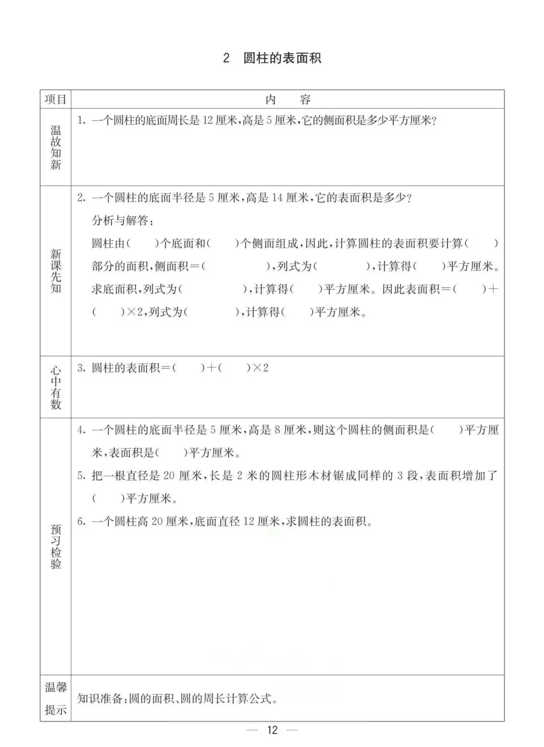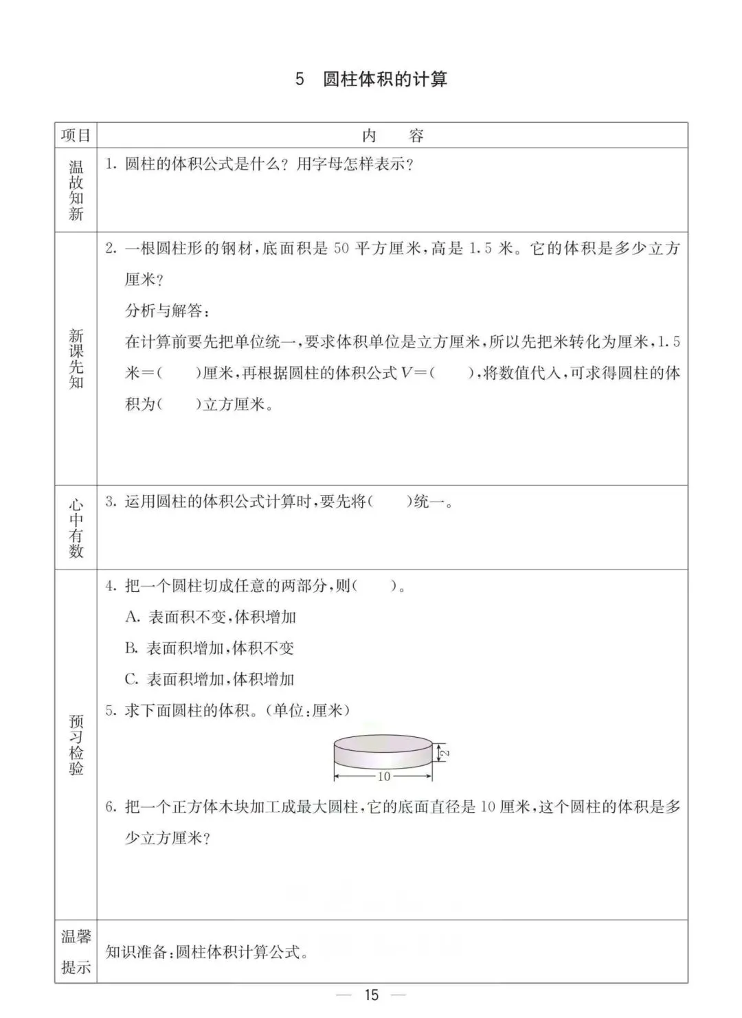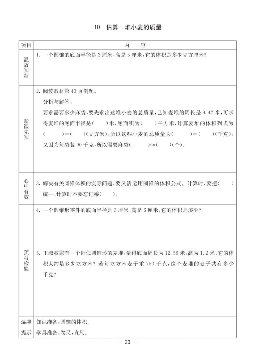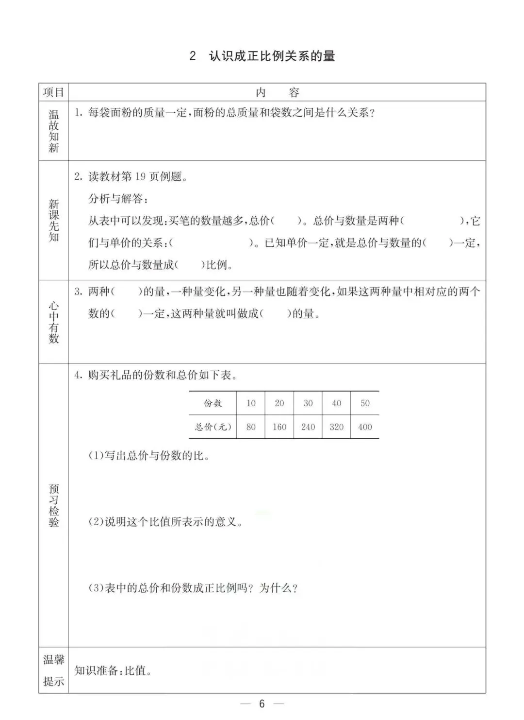 六年级下册冀教版数学《课时预习卡》,电子版可打印