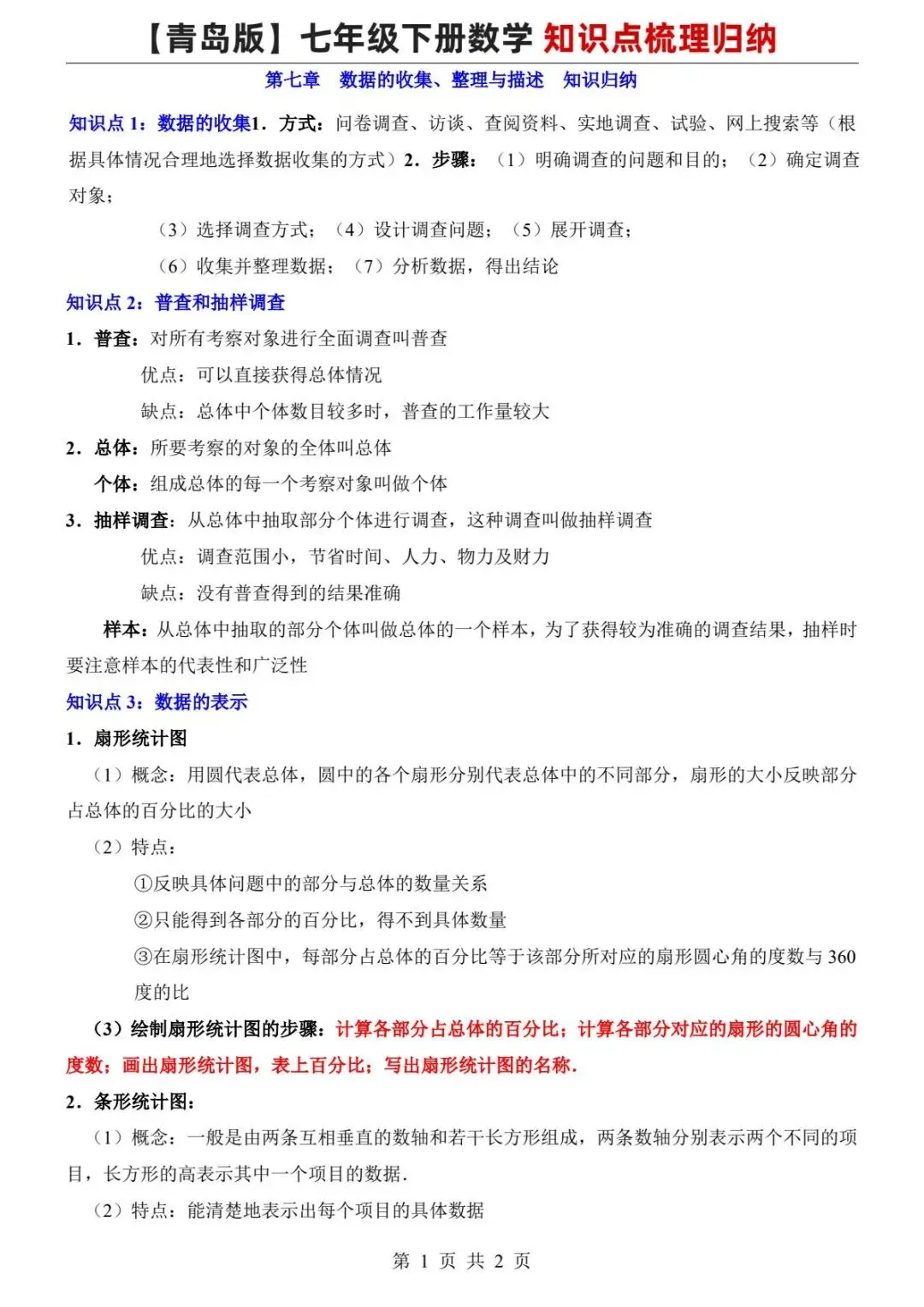 2026春青岛版七年级下册数学《重要知识点归纳总结》,高清完整可打印