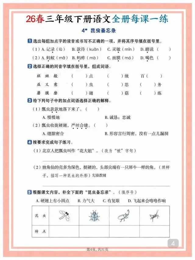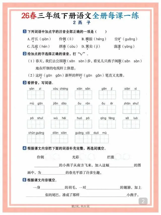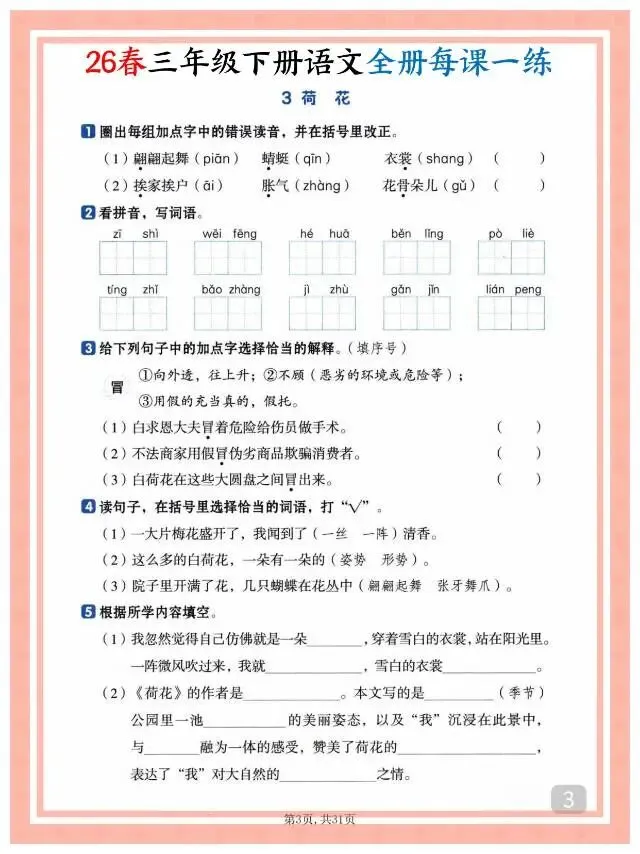 这份26春三年级下册语文全册每课一练课时练,贴合教材课时进度,涵盖字音、字形、词句、课文理解、思维拓展等多元题型,每课配套练习直击知识点,且附完整答案,方便学生自主练习、家长辅导与课堂同步检测。练习设计由浅入深,兼顾基础巩固与能力提升。
