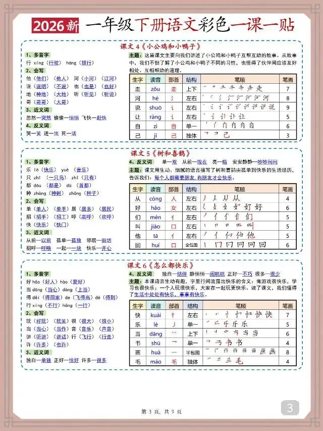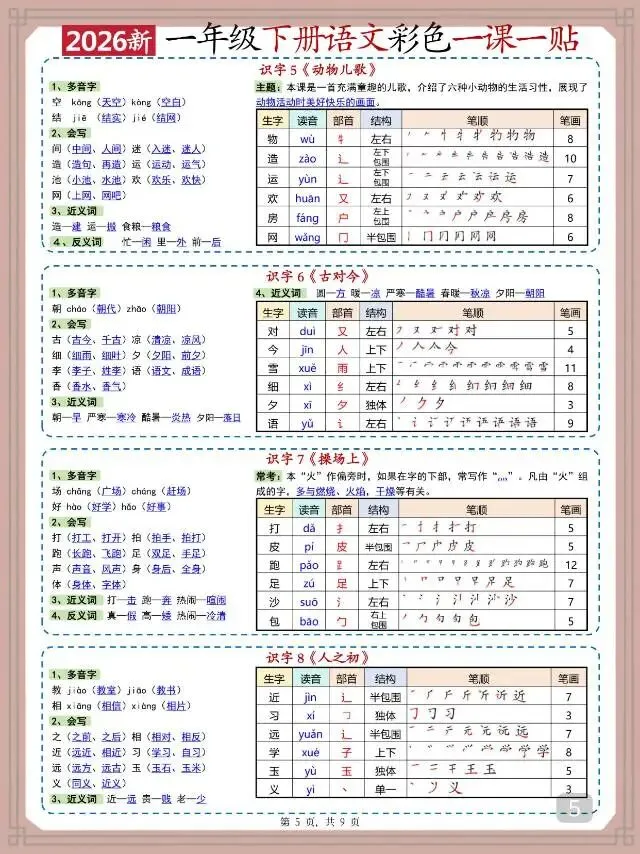 这份2026新一年级下册语文彩色一课一贴,紧扣教材同步编排,覆盖全册识字与课文内容。核心包含多音字、会写生字、部首、近反义词等基础知识点,还搭配生字读音、结构、笔画等详细表格,直观清晰,同时融入课文主题解析,兼顾知识积累与理解。
