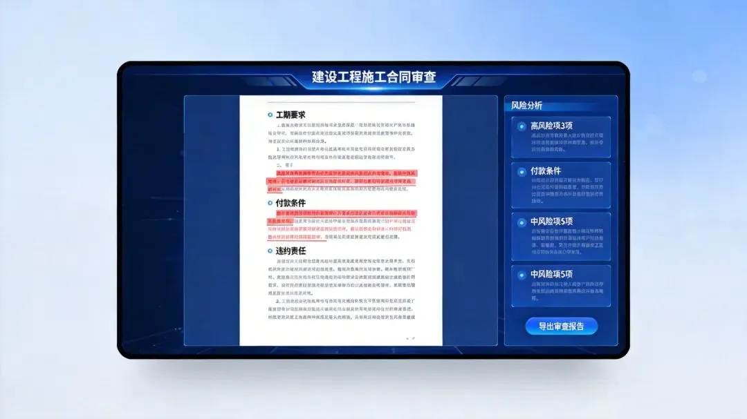 一份50页的施工合同需要你审查,重点关注风险条款。传统方式需要3天仔细阅读,还可能遗漏隐藏的风险点。