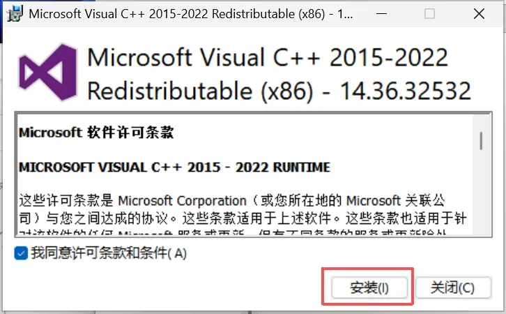 2、进入解压后的文件,双击打开“VC_redist.x86”后出现安装页面,点击“安装”。