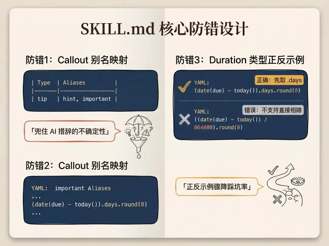 Markdown Skill 基于 CommonMark + GitHub Flavored Markdown + Obsidian 扩展语法。它要处理的核心难题是 AI 用词的不确定性——同一种 callout,AI 可能叫它 tip,也可能叫 hint 或 important。规范里用一张 别名映射表 把 13 种 callout 类型和所有别名全部罗列,AI 随便用哪个都是合法的。
