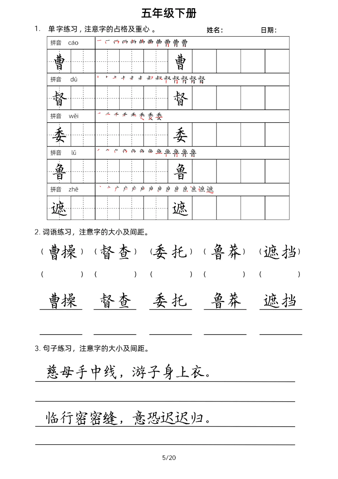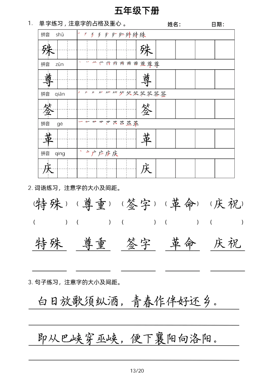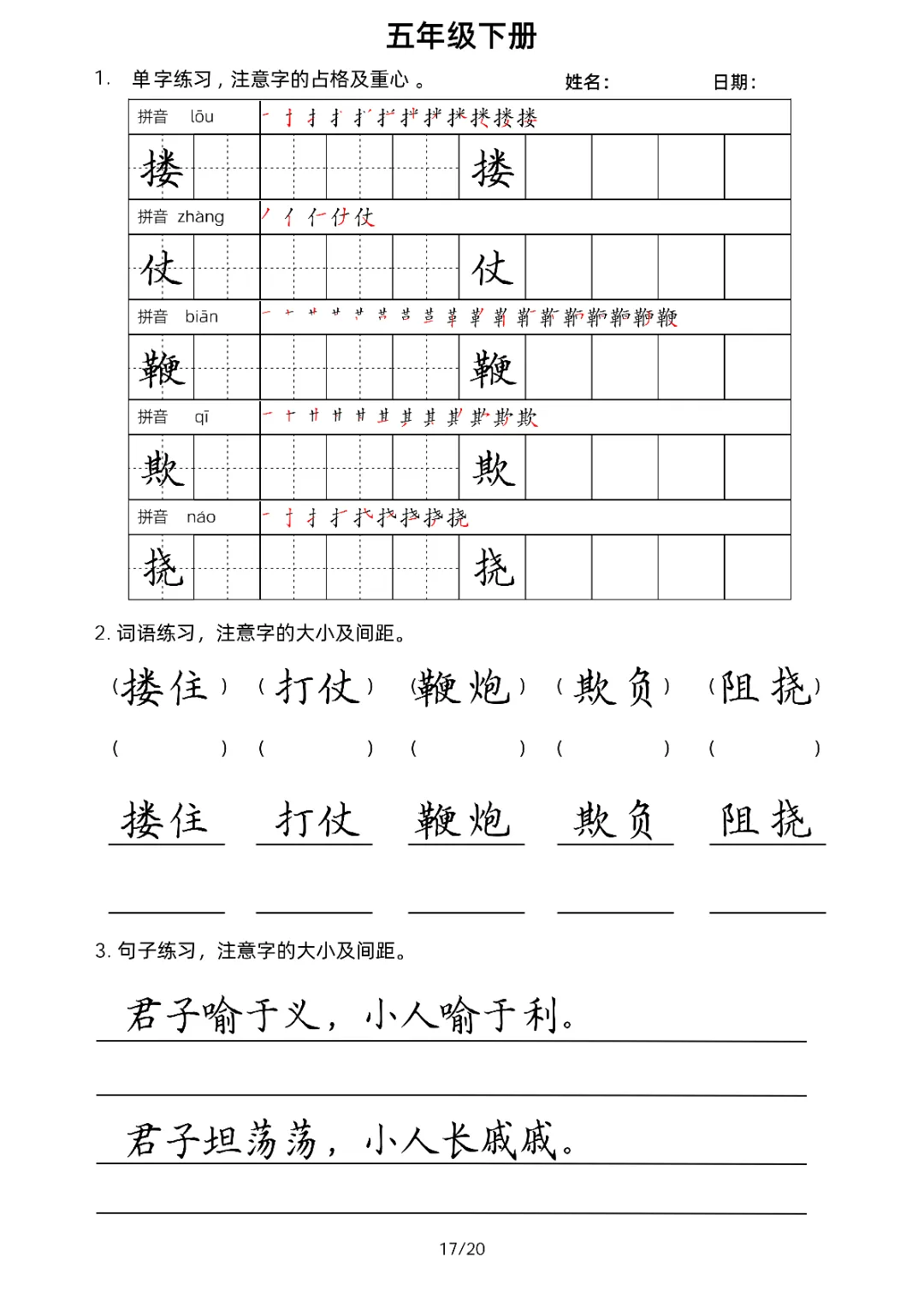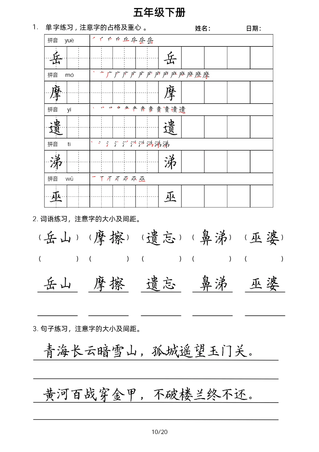 五年级下册语文考试卷面书写练习(电子版可打印)
