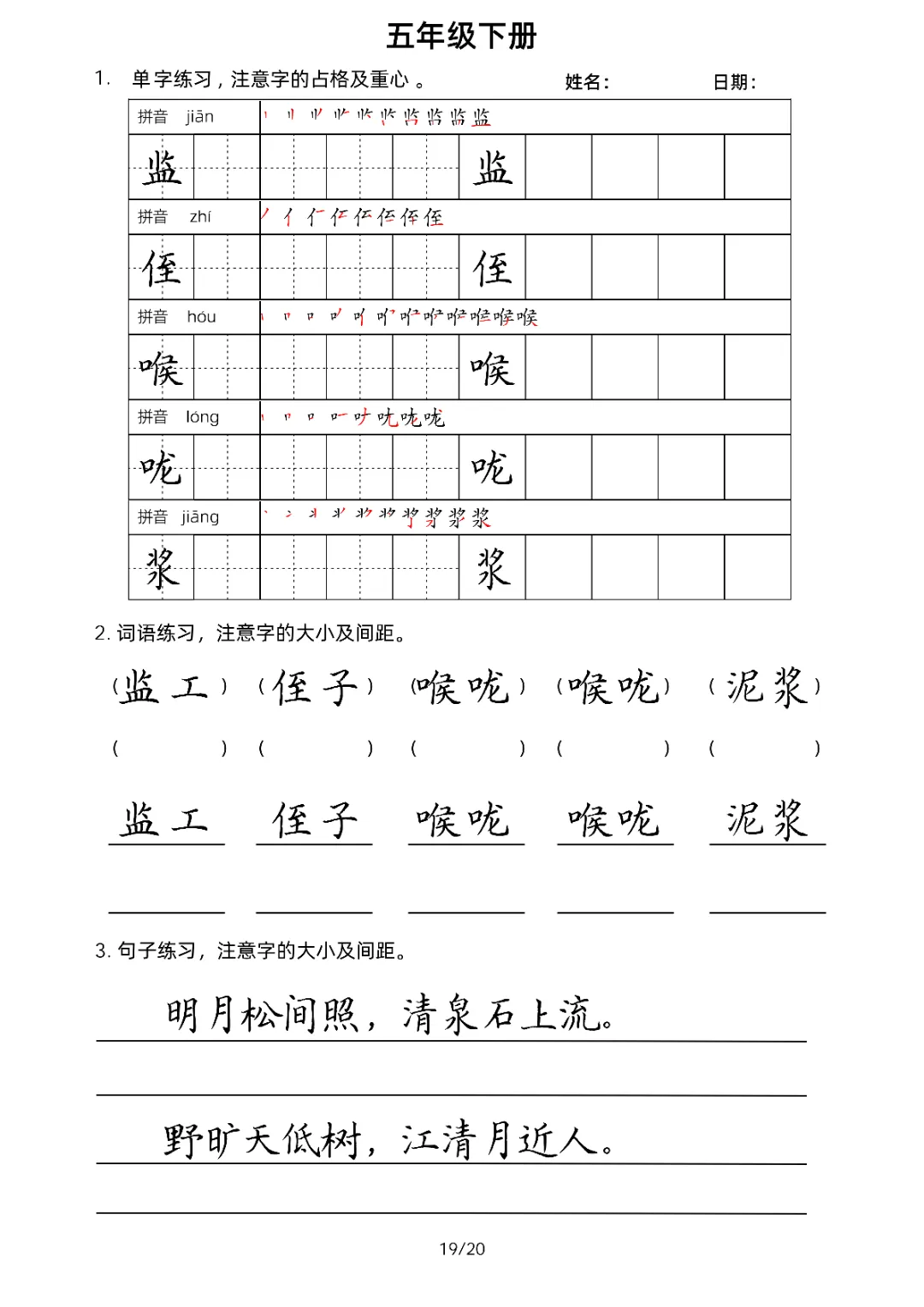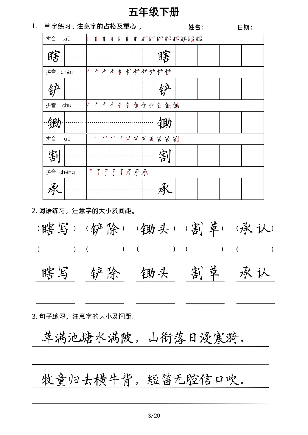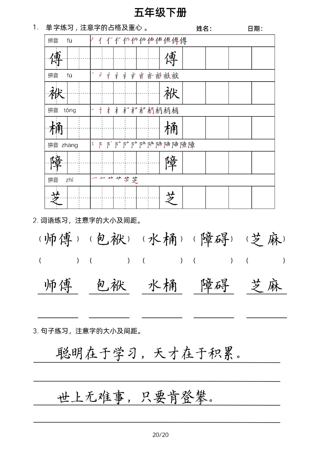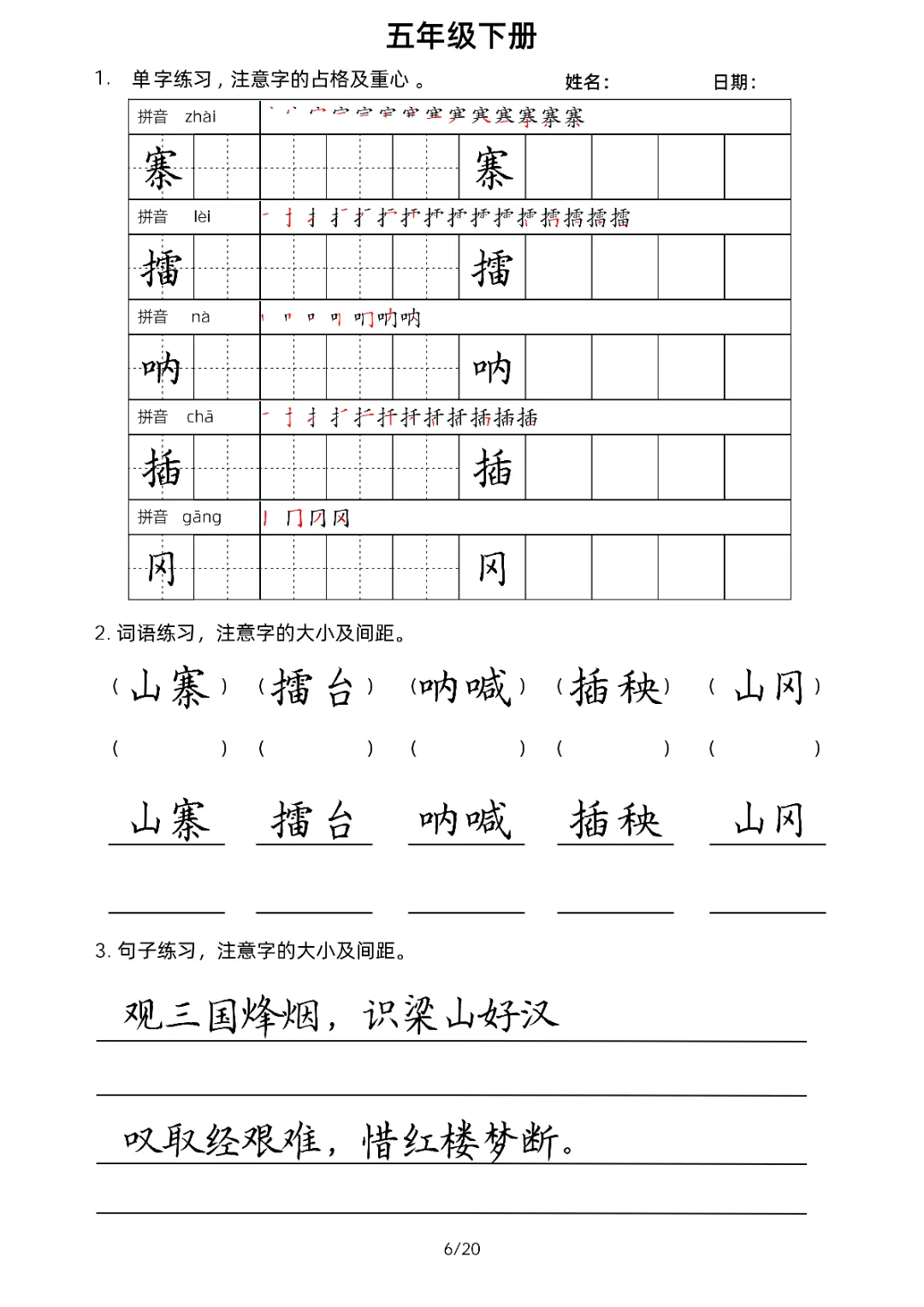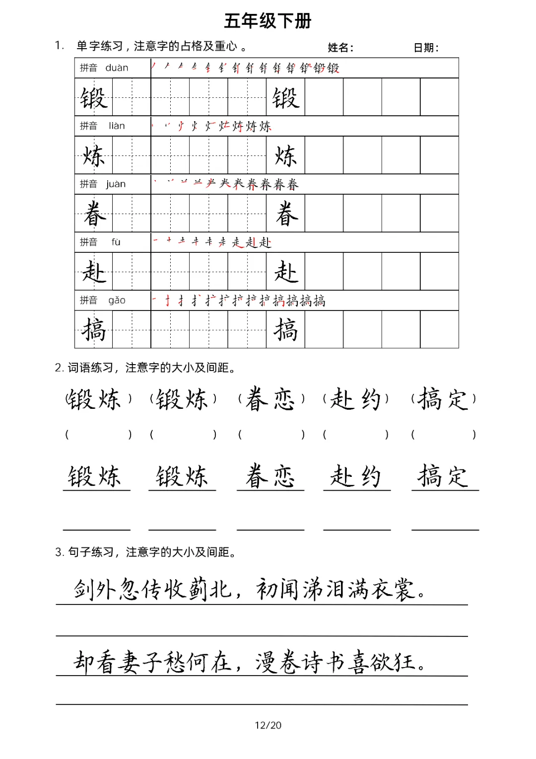 五年级下册语文考试卷面书写练习(电子版可打印)