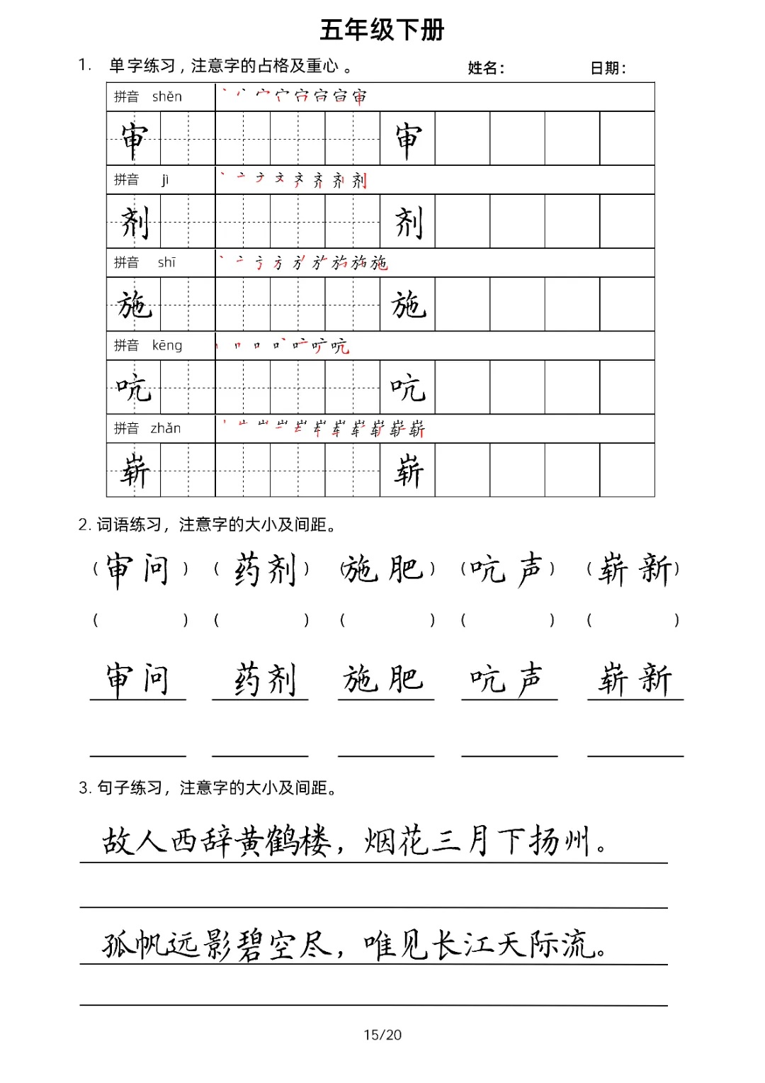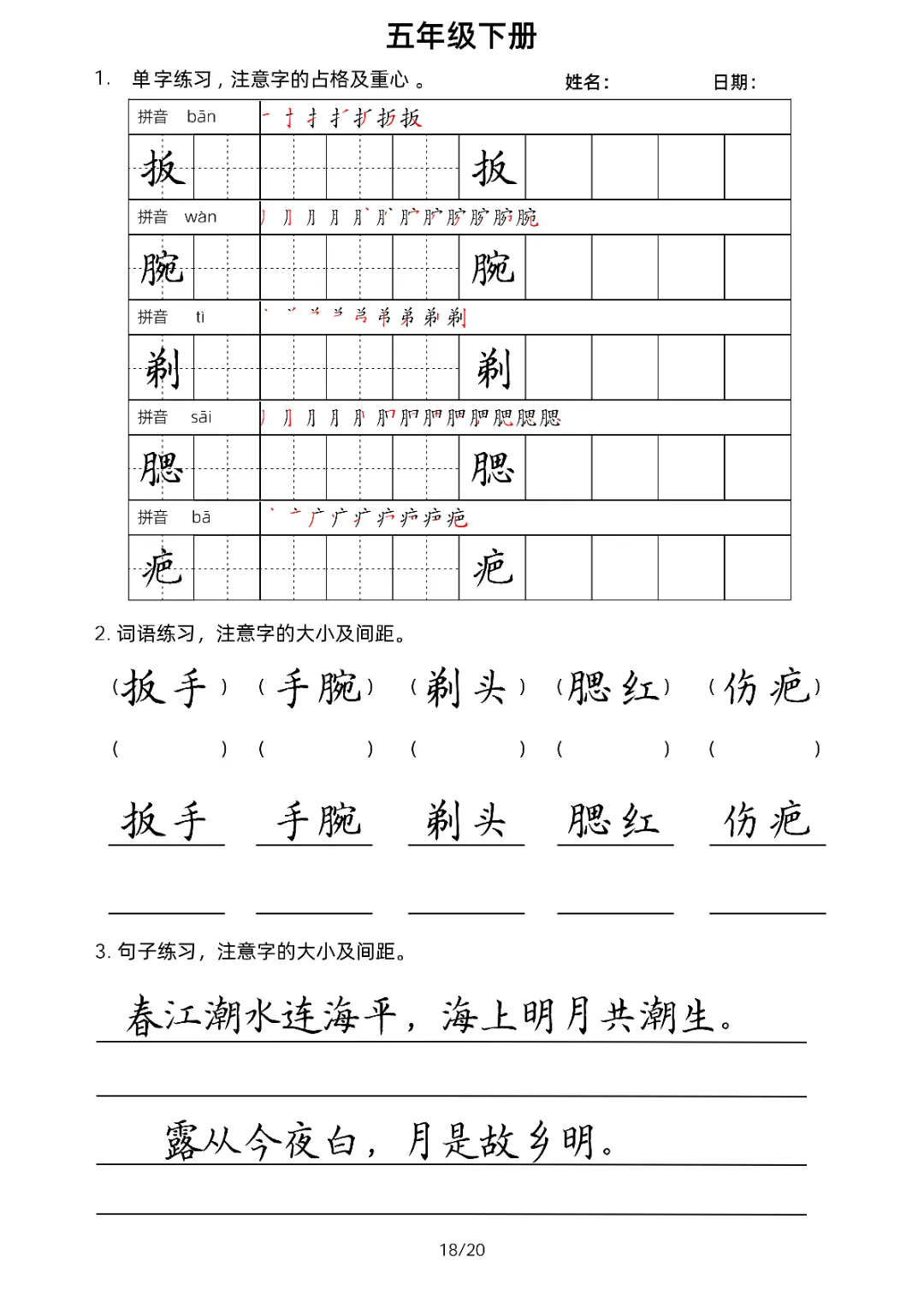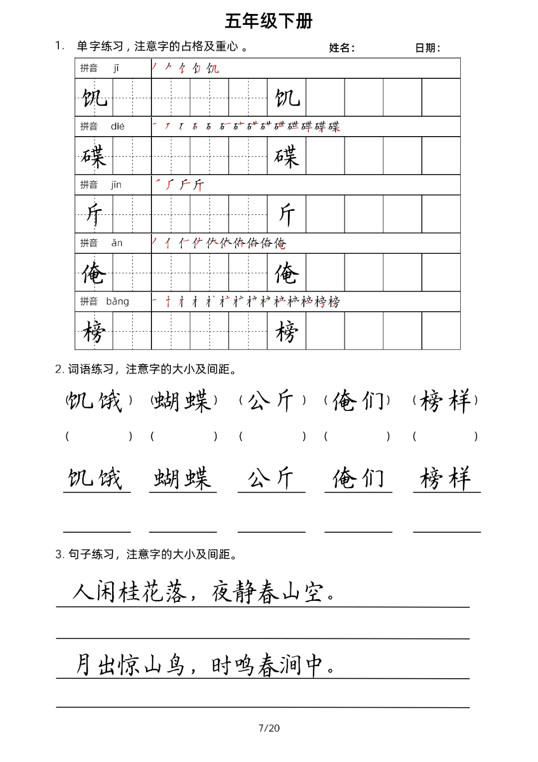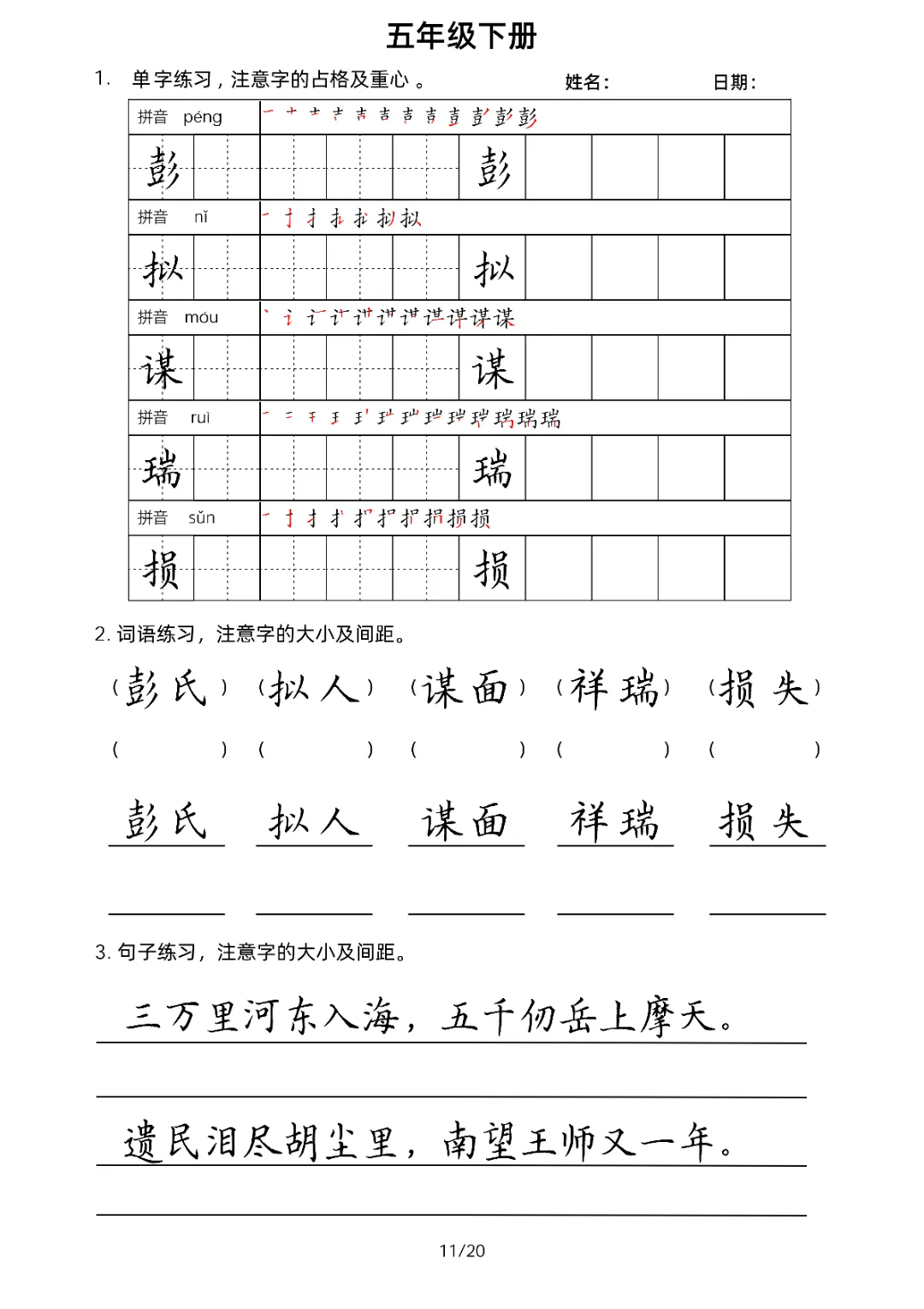 五年级下册语文考试卷面书写练习(电子版可打印)