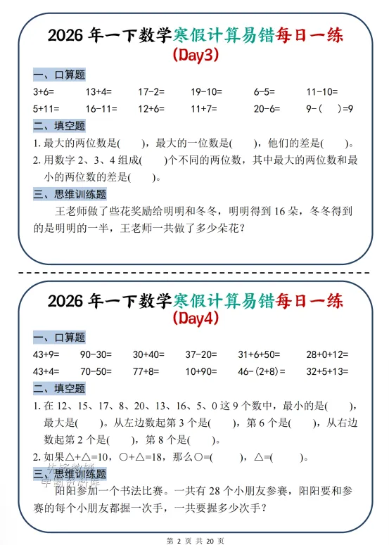 26(新版)一下数学寒假计算易错每日一练共20页(完整版),电子版高清可下载可打印。因篇幅有限,仅展示部分内容。有需要的家长快给孩子领取一份,让孩子在寒假期间每日一练计算易错!