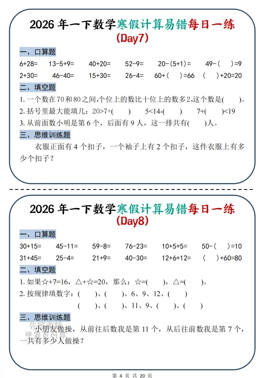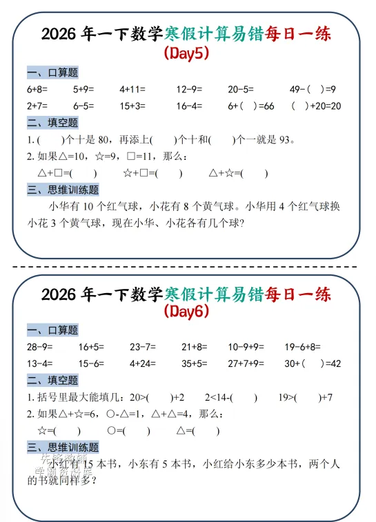 2026年一下数学寒假计算易错每日一练,电子版可打印