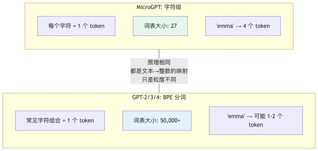 虽然 MicroGPT 的字符级分词器是最简单的分词方案。但是了解它后,理解更复杂的分词器如 BPE (Byte Pair Encoding)分词(GPT-2/3/4 使用的生产级分词方案)也会更容易: