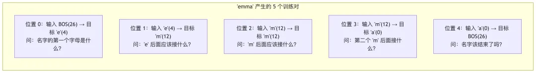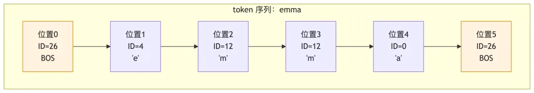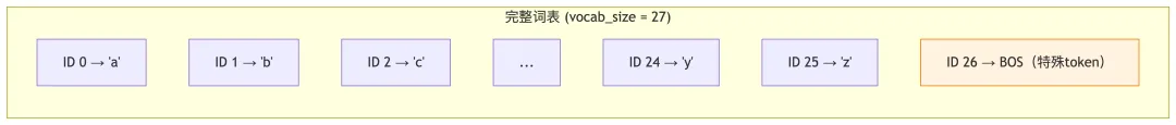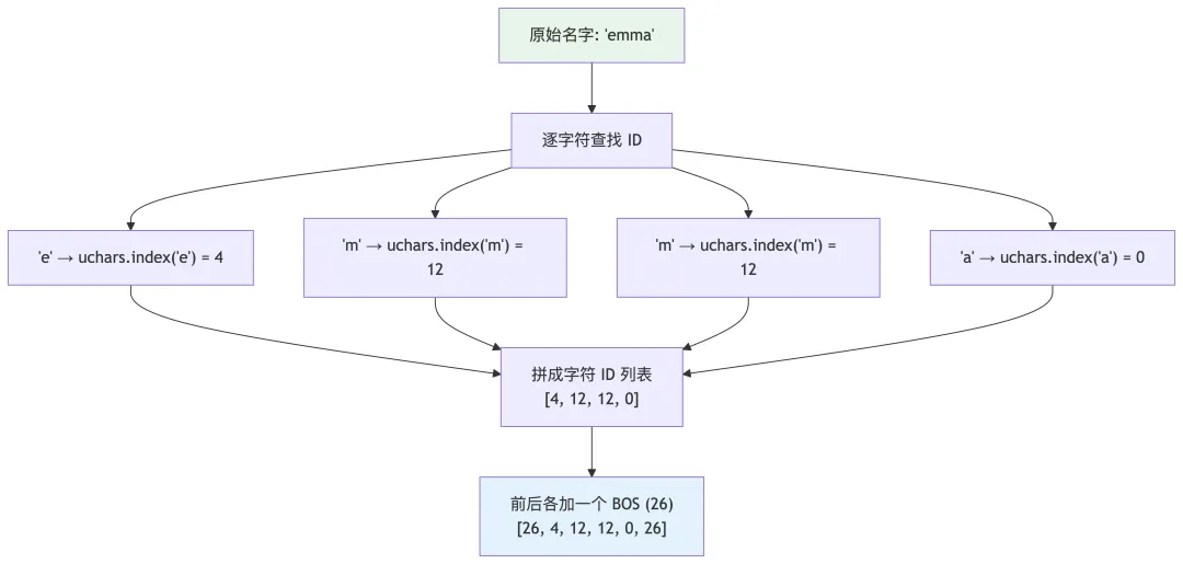 MicroGPT 使用最简单的分词方式——字符级分词:每个字符对应一个整数编号(这点和 ASCII 码的思路是一致的,不同的是字符级分词的编码值按排序顺序从 0 开始紧密编排,词表尽可能小 – 极简目标)。