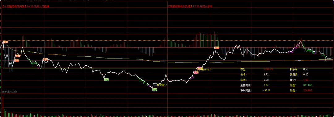 DRAWTEXT_FIX(1,0.87,0.95,0,’外盘:’),COLORYELLOW;