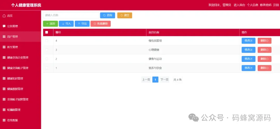 个人健康管理系统的重要核心功能包括用户注册和登录、健康知识管理、健康分享交流区、健康数据管理、健康数据分析、在线客服等,以下为项目功能模块图: