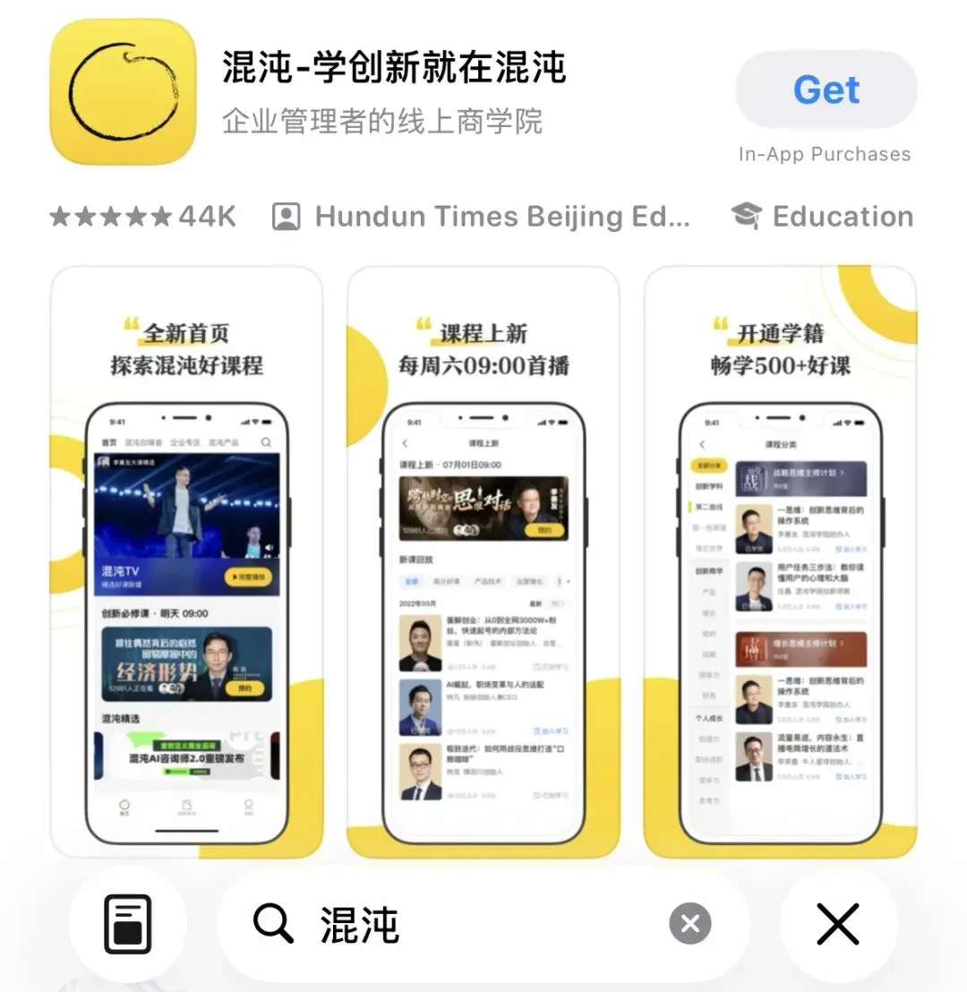 这款APP就是混沌。它成立于2014年,以“陪伴这个时代最有梦想的人”为理念,打造没有围墙的创新教育平台,混沌APP作为其核心线上载体,于2017年正式上线,多年来聚焦创新教育与认知升级,不迎合流量、不追求速成,坚持做长期主义的知识产品。