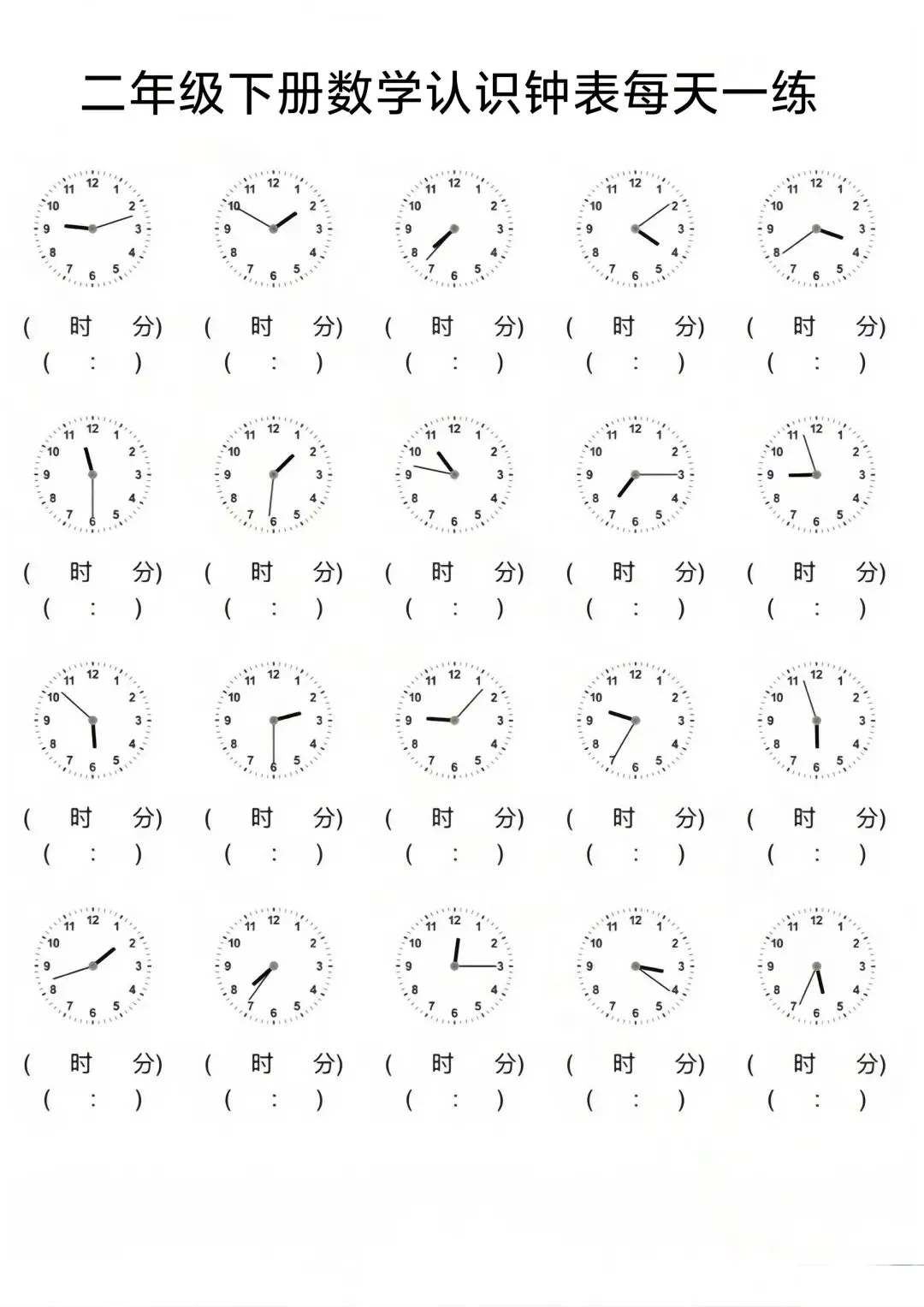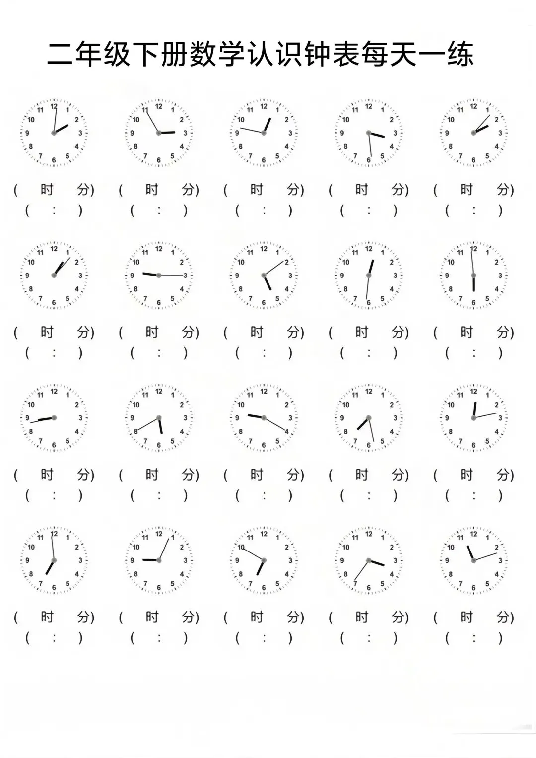 二年级数下册数学钟表每天练习(电子版可打印) 二年级下册数学重难点——认识时间专项练习来啦! 重点考察孩子对时针、分针的读法,赶紧收藏转发给孩子练一练吧! 篇幅有限 添加我获取完整电子版 进群免费领取1-6年级教育教学优质资源