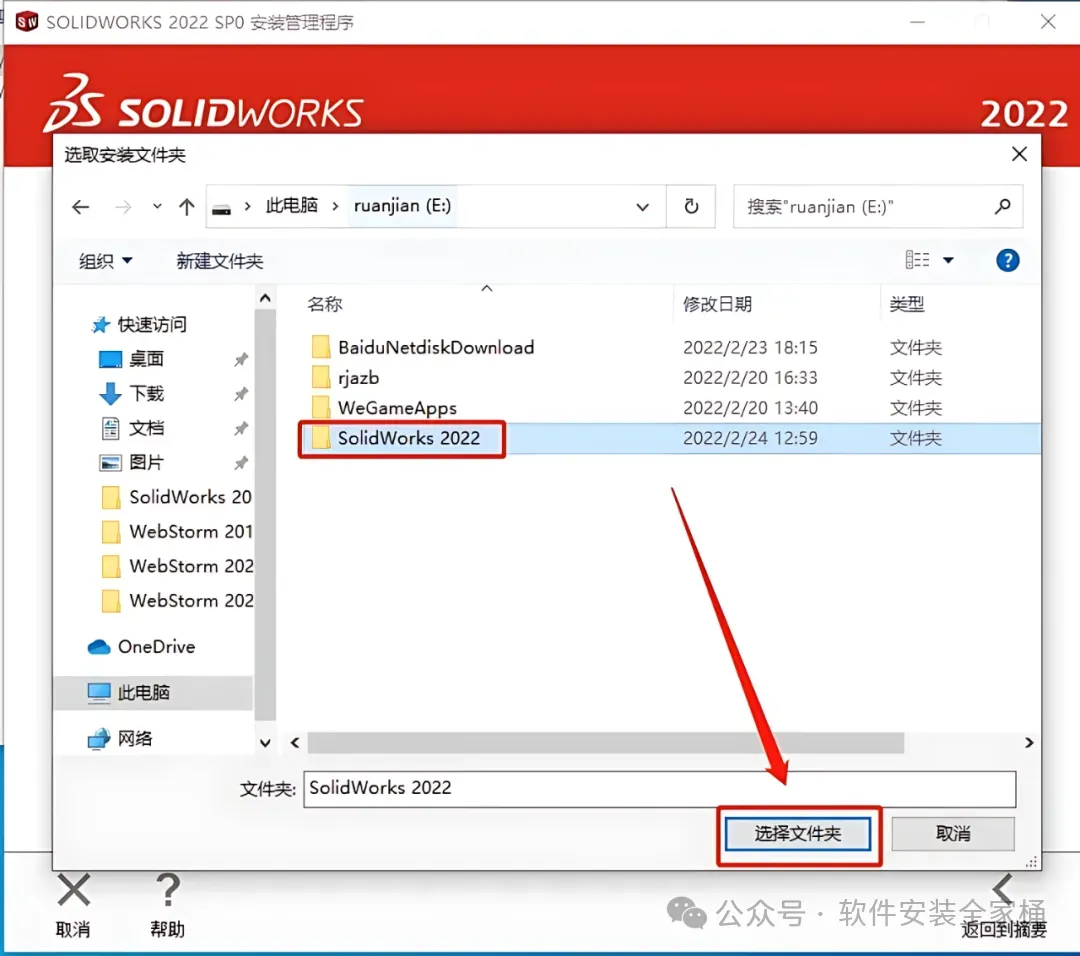 22.可在D盘或者其它磁盘中新建一个【SolidWorks 2022】文件夹,然后选中后点击【选择文件夹】。