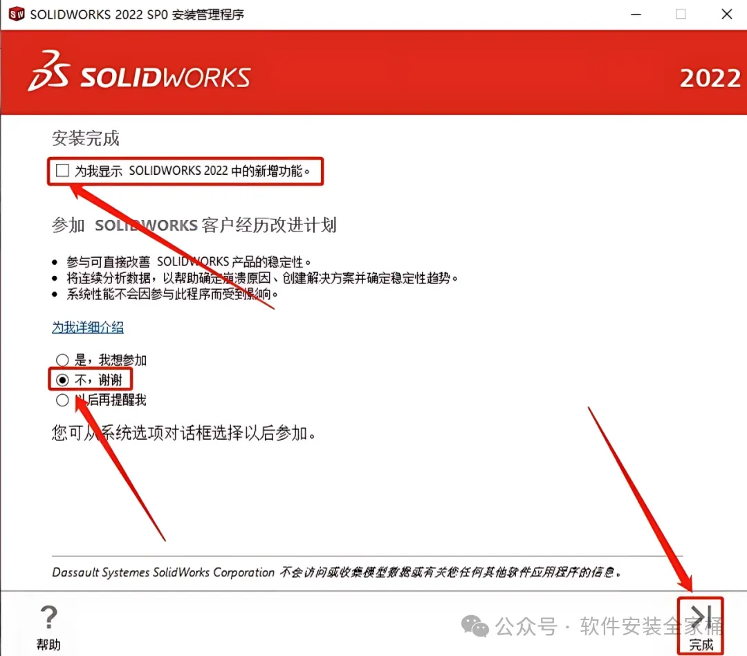27.安装结束后取消勾选【为我显示····新增功能】,选择【不,谢谢】,然后点击【完成】。