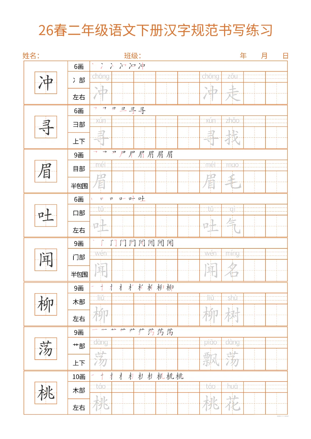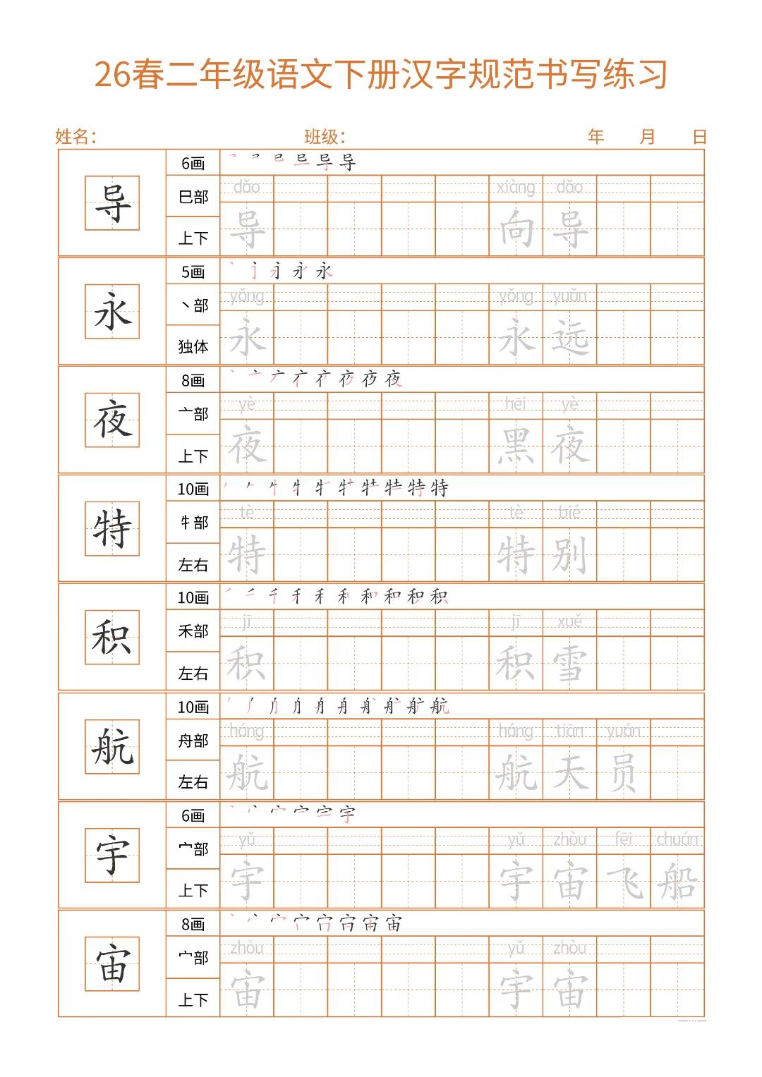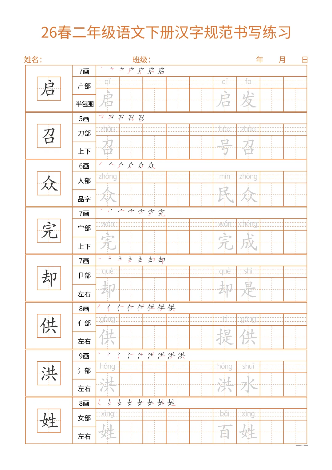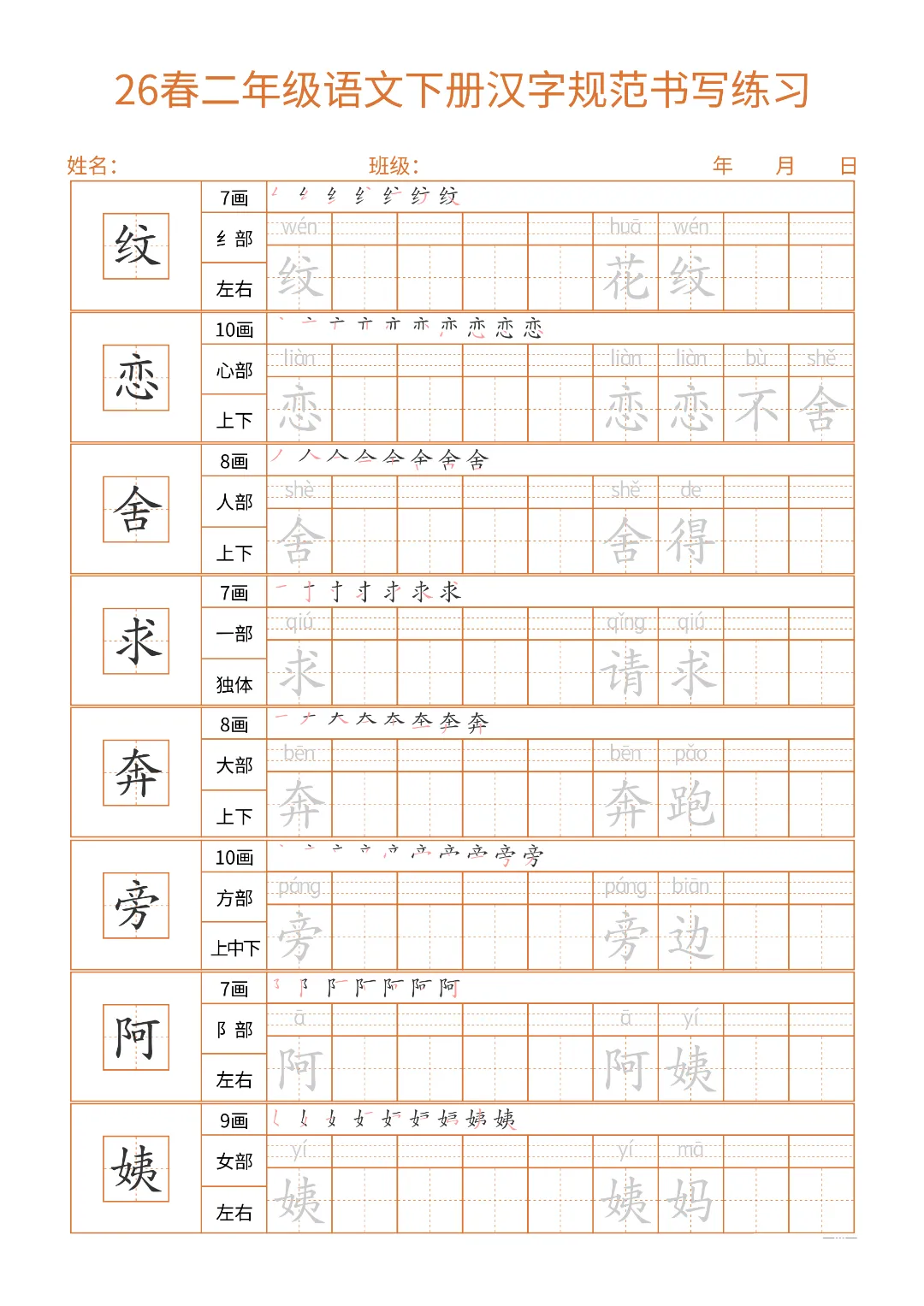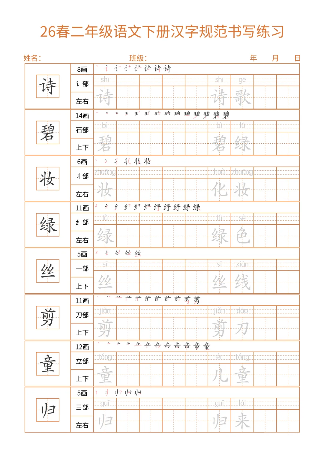 26年春人教版二年级下册语文写字表同步生字帖,共32页,电子版可下载可打印,这份二下语文生字字帖,涵盖了语文课本中必须掌握的一类生字,让孩子在临摹中熟写所学生字和拼音,为二年级的语文学习奠定基础。需要的家长抓紧打印出来,让孩子练一练吧!