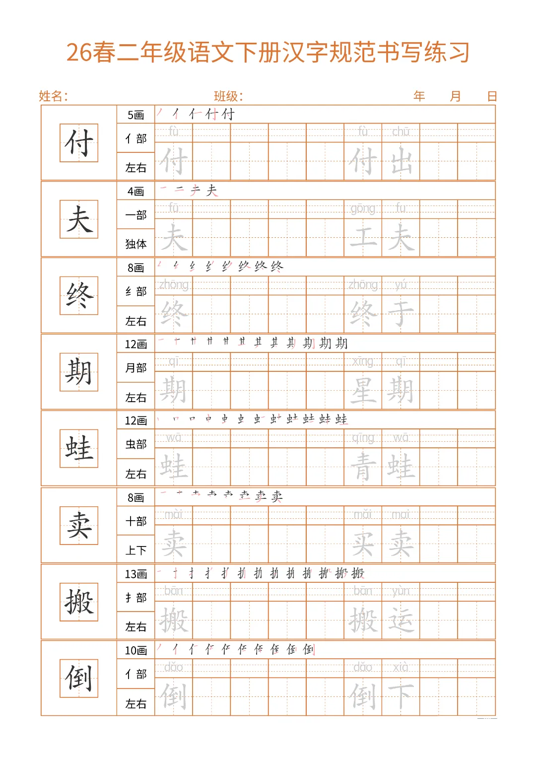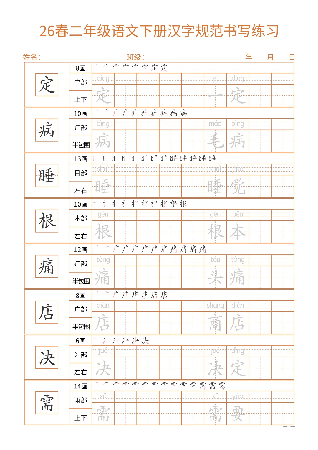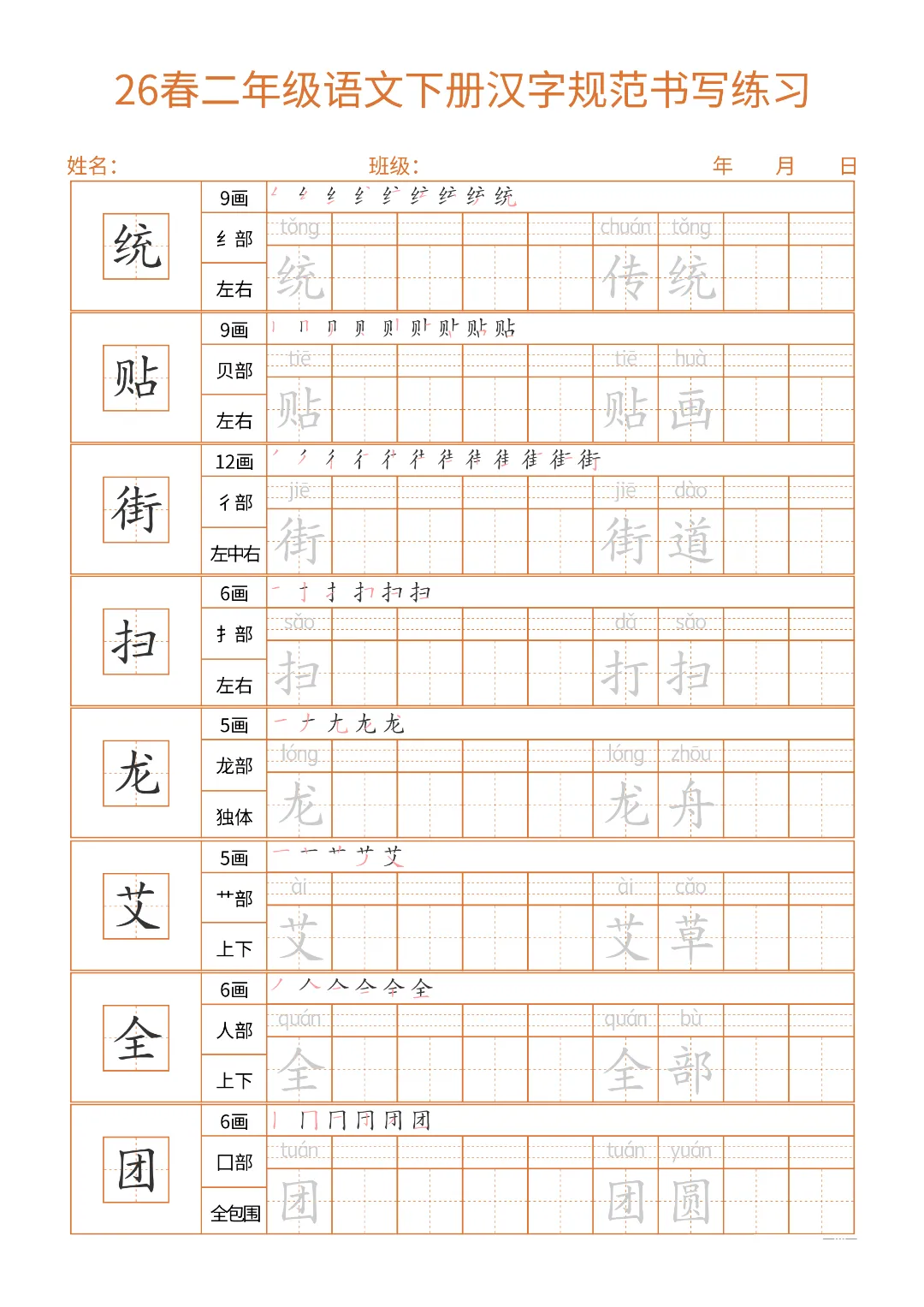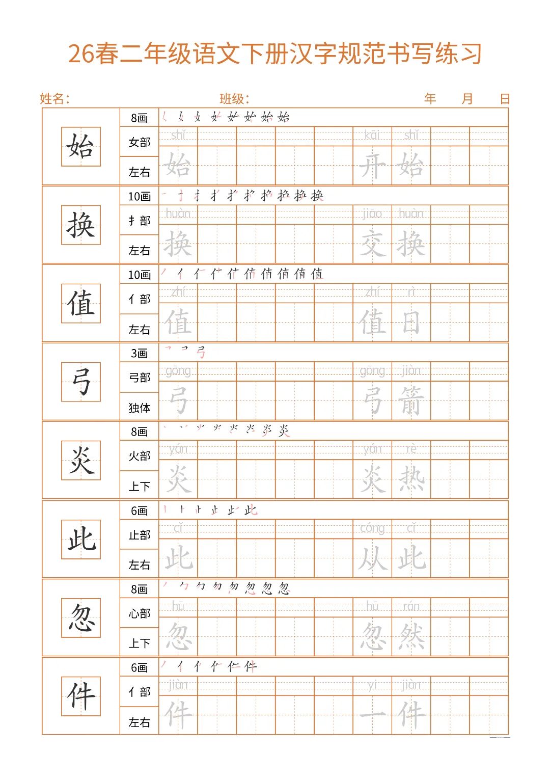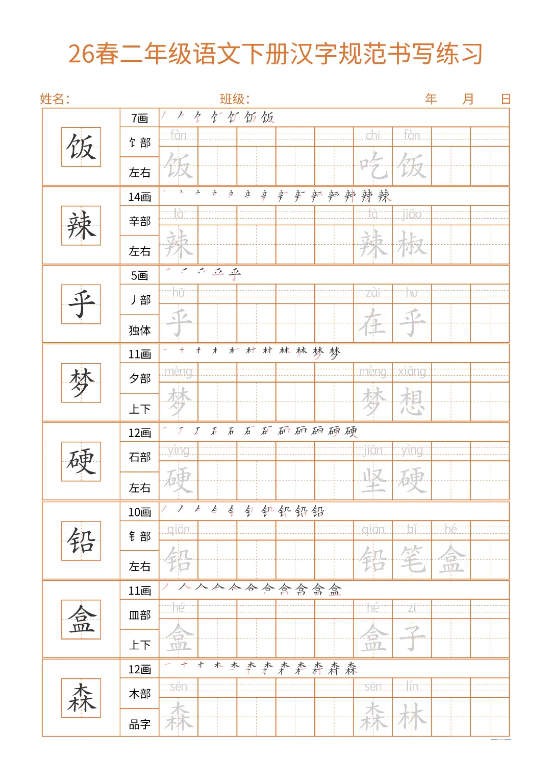 26年春人教版二年级下册语文写字表同步生字帖,共32页,电子版可下载可打印,这份二下语文生字字帖,涵盖了语文课本中必须掌握的一类生字,让孩子在临摹中熟写所学生字和拼音,为二年级的语文学习奠定基础。需要的家长抓紧打印出来,让孩子练一练吧!