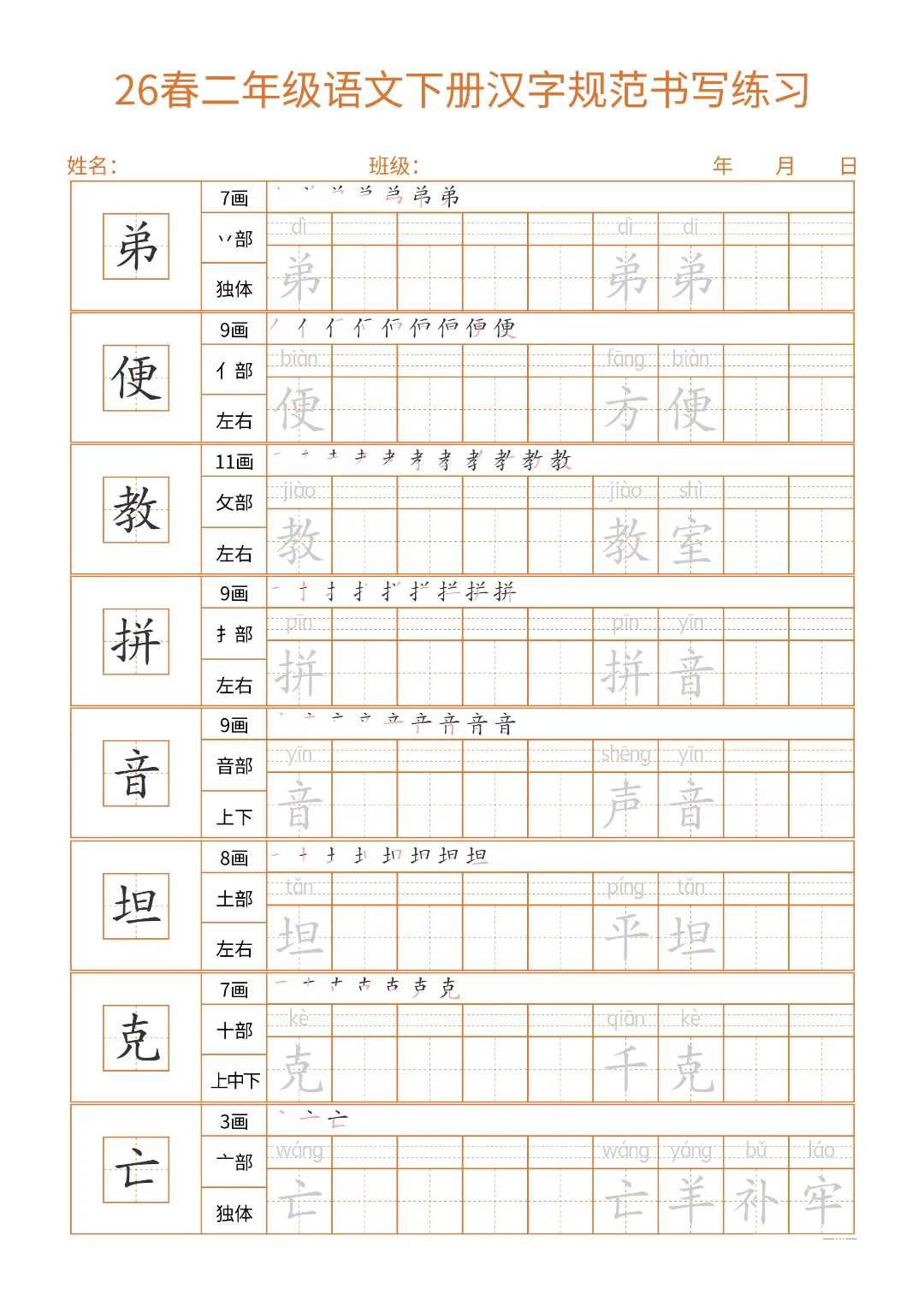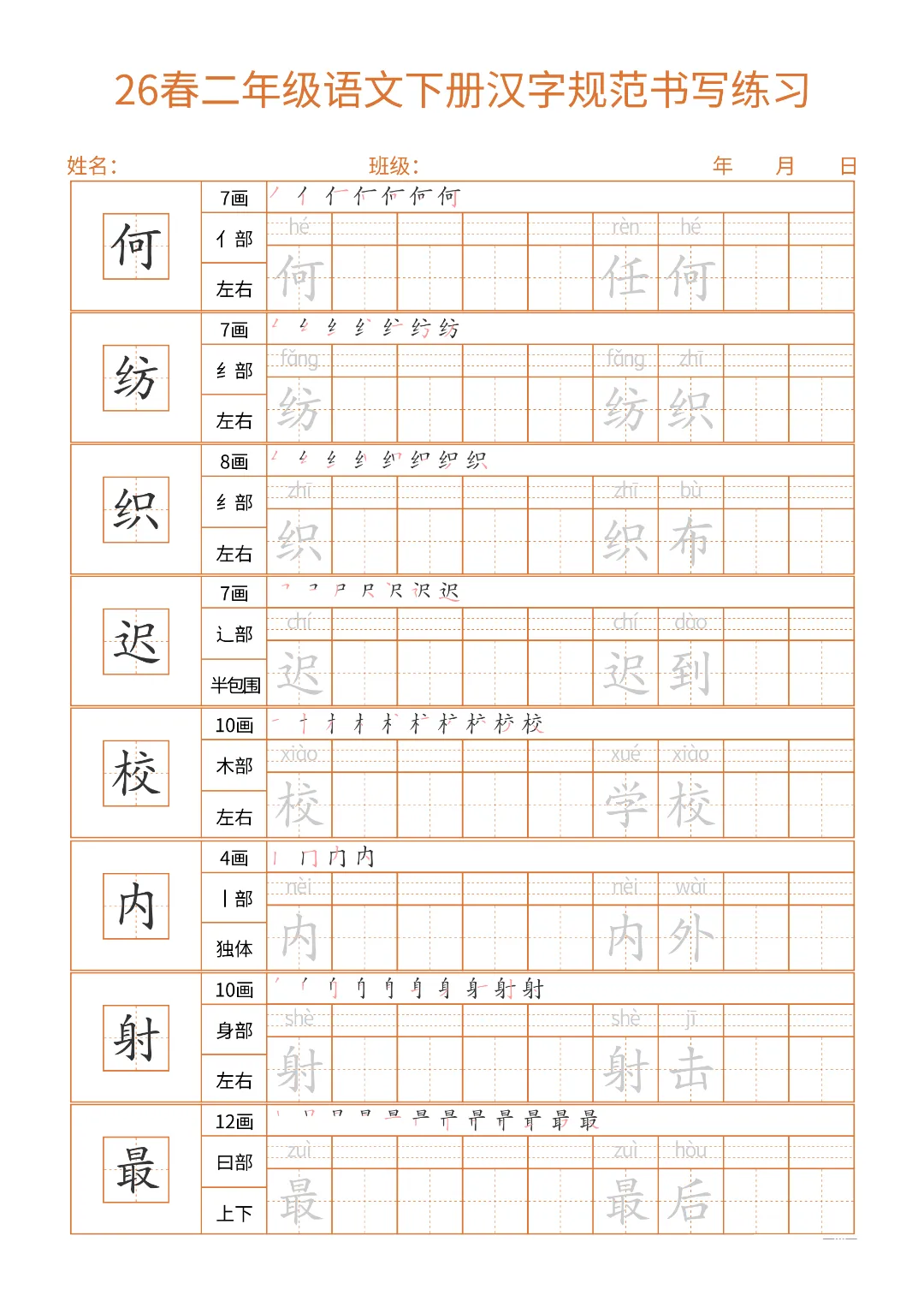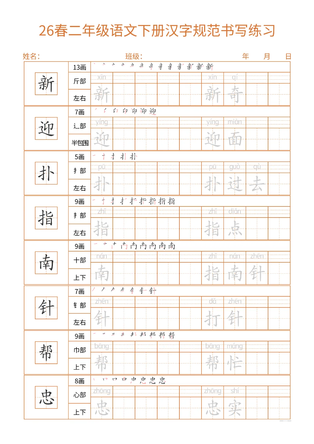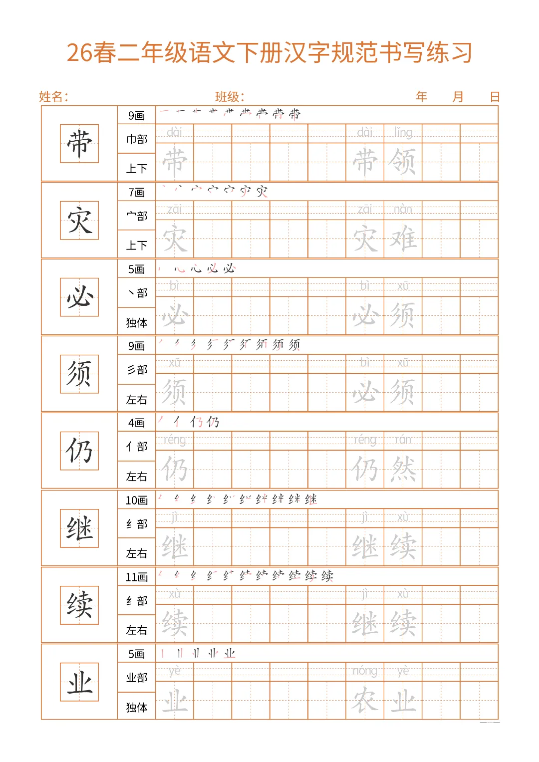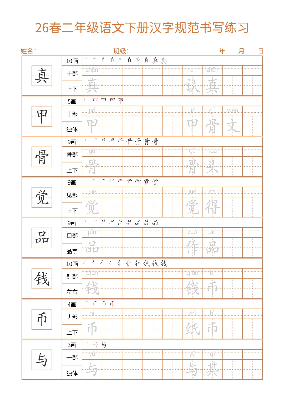 26年春人教版二年级下册语文写字表同步生字帖,共32页,电子版可下载可打印,这份二下语文生字字帖,涵盖了语文课本中必须掌握的一类生字,让孩子在临摹中熟写所学生字和拼音,为二年级的语文学习奠定基础。需要的家长抓紧打印出来,让孩子练一练吧!
