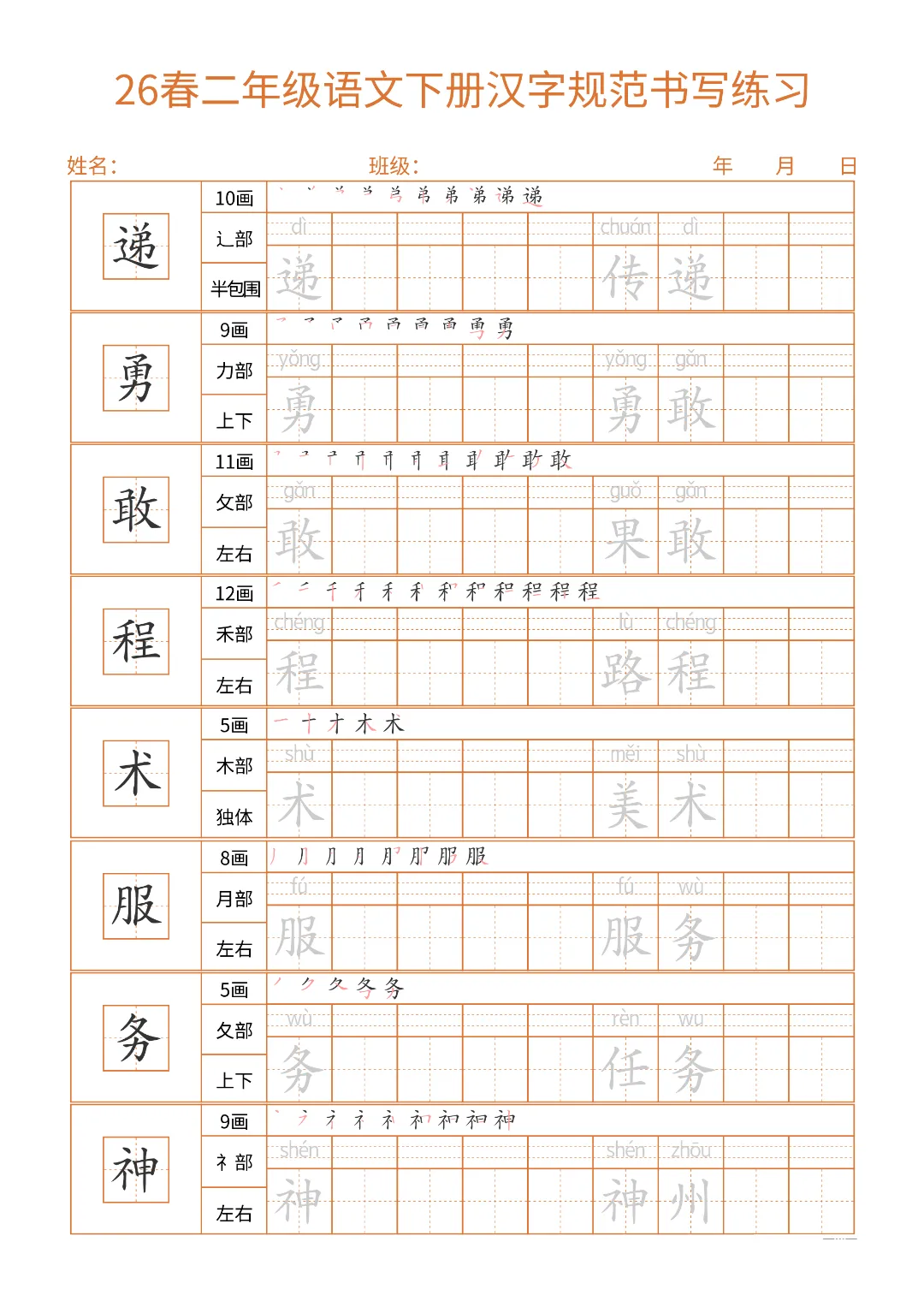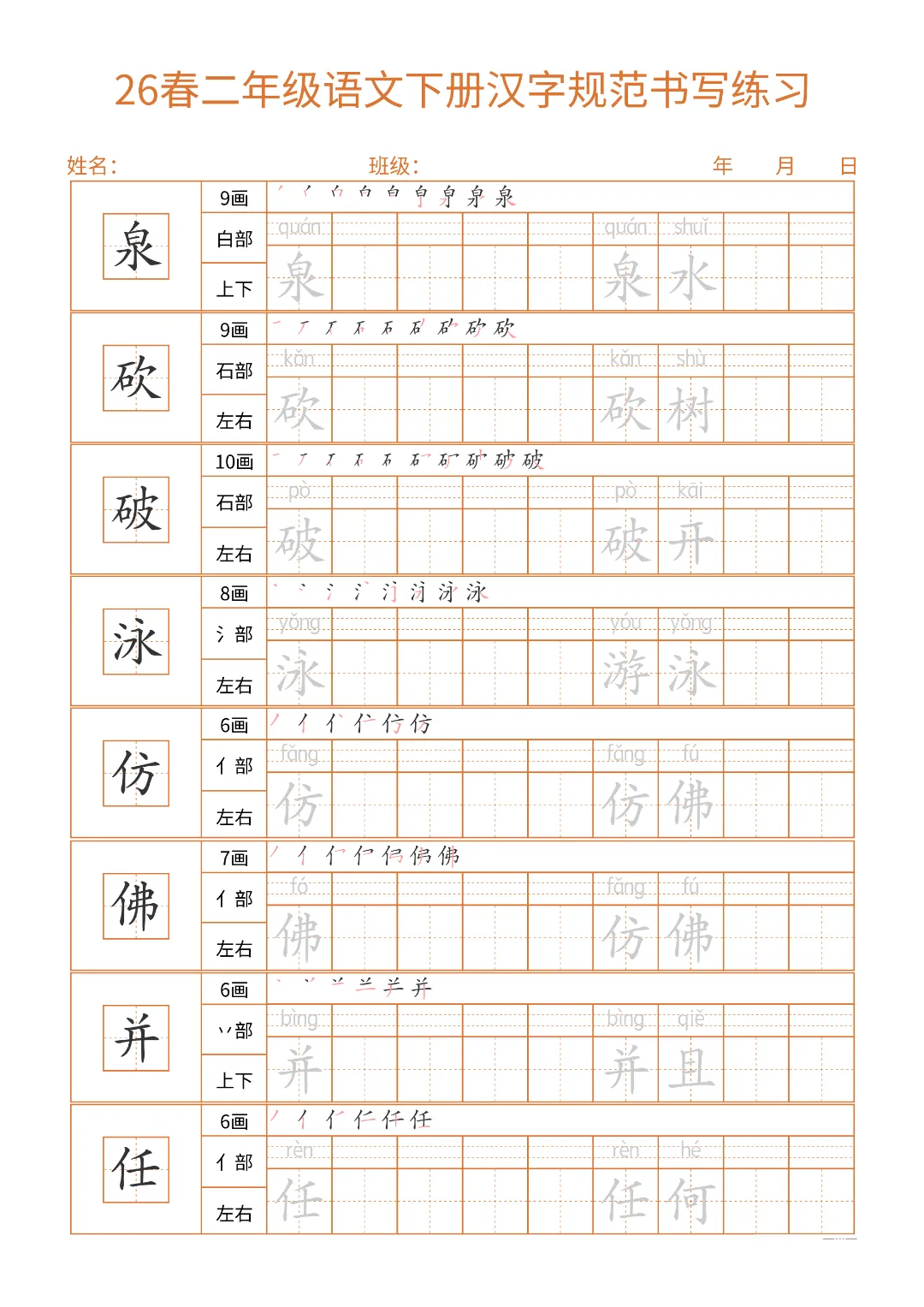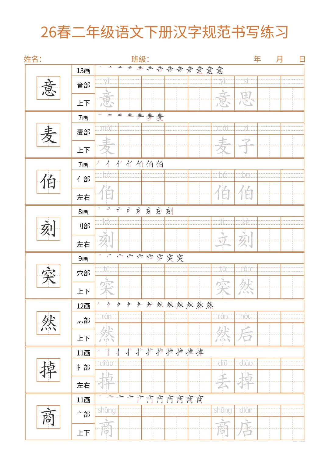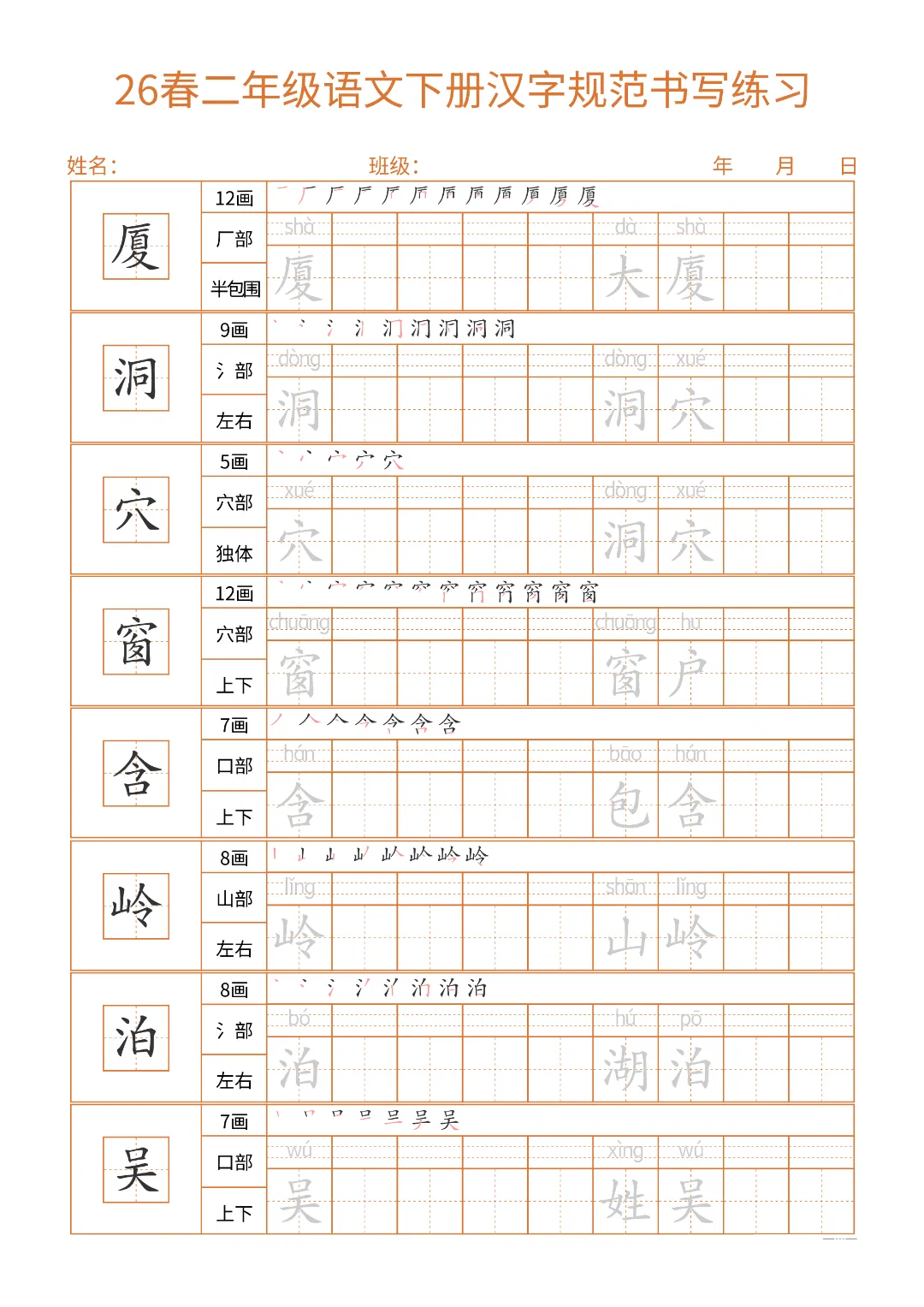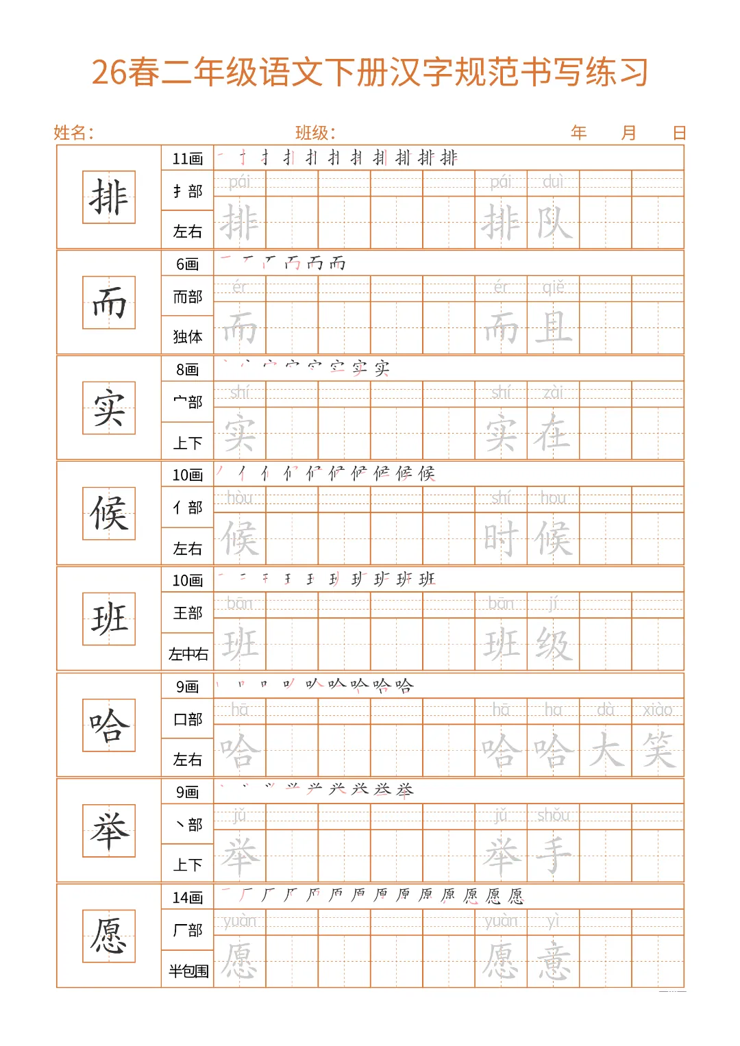 26年春人教版二年级下册语文写字表同步生字帖,共32页,电子版可下载可打印,这份二下语文生字字帖,涵盖了语文课本中必须掌握的一类生字,让孩子在临摹中熟写所学生字和拼音,为二年级的语文学习奠定基础。需要的家长抓紧打印出来,让孩子练一练吧!