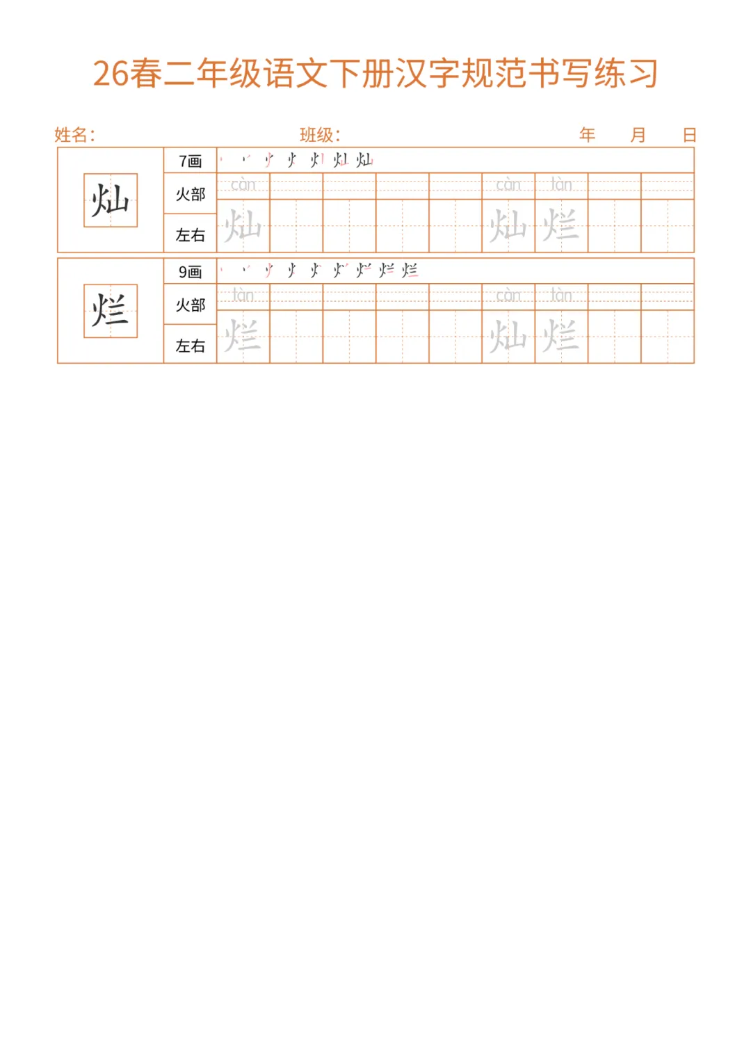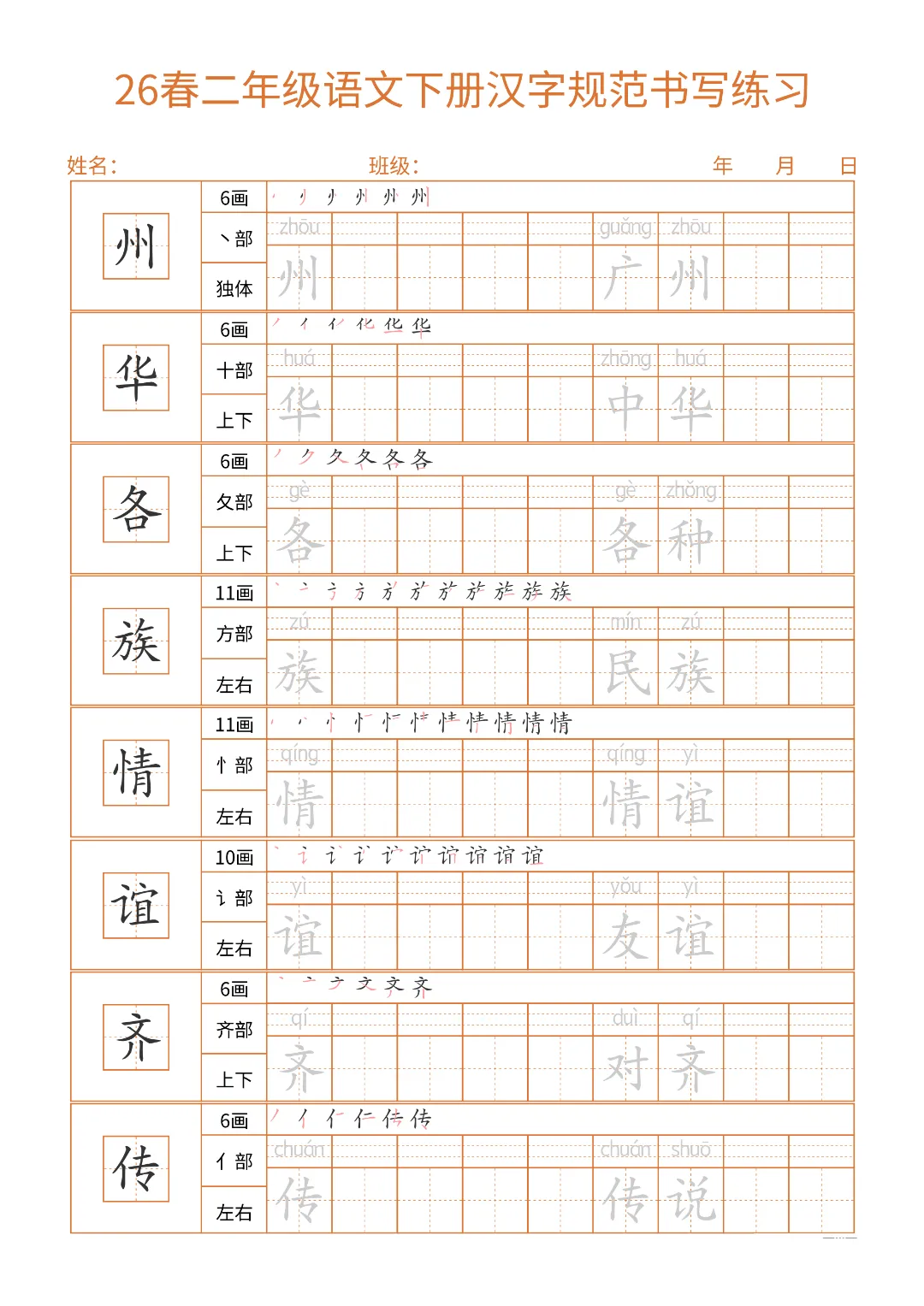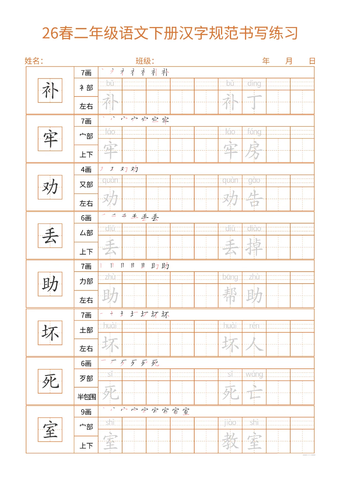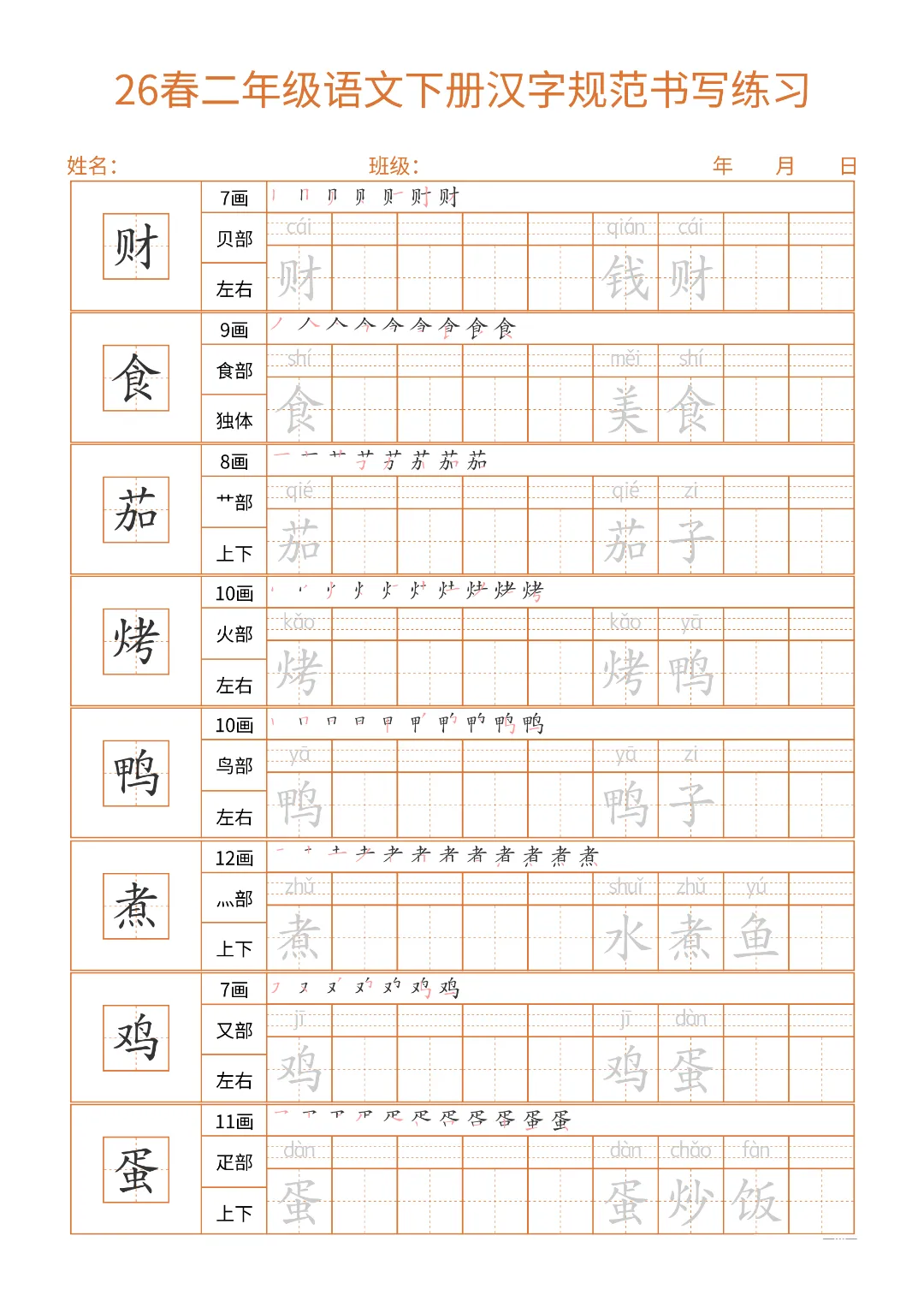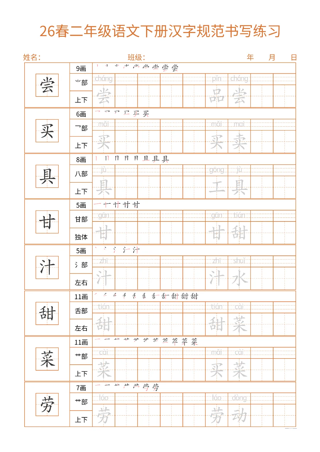 26年春人教版二年级下册语文写字表同步生字帖,共32页,电子版可下载可打印,这份二下语文生字字帖,涵盖了语文课本中必须掌握的一类生字,让孩子在临摹中熟写所学生字和拼音,为二年级的语文学习奠定基础。需要的家长抓紧打印出来,让孩子练一练吧!
