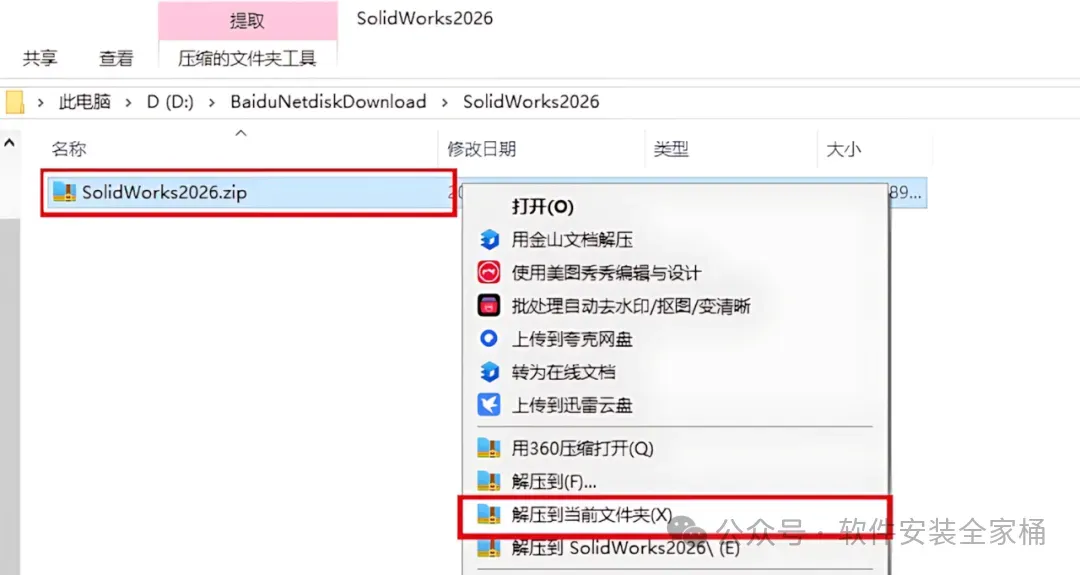 1、打开下载的SolidWorks 2026软件安装包,鼠标右击压缩包选择【解压到当前文件夹】。