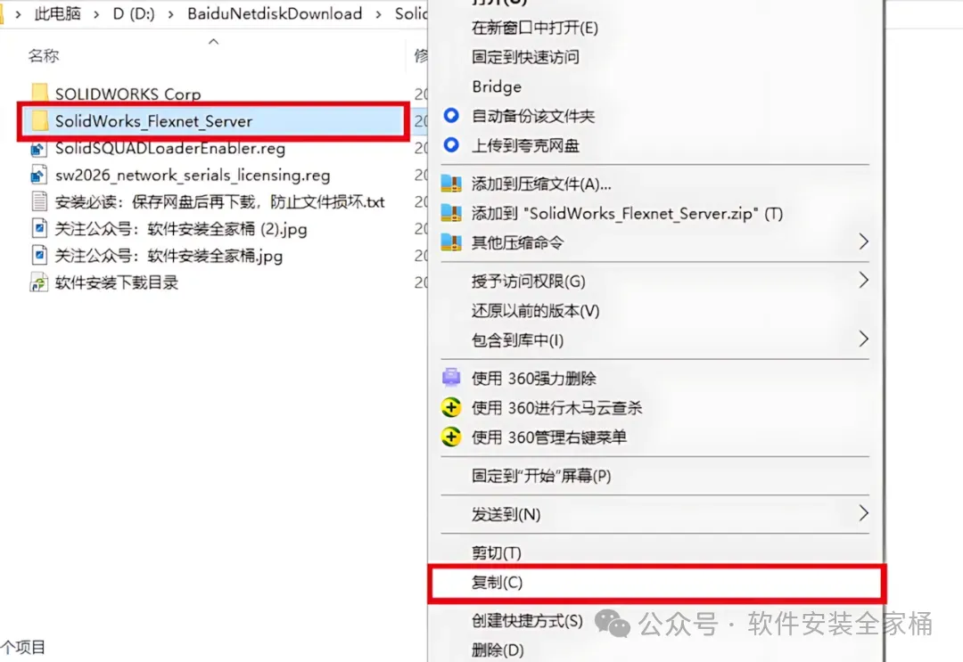 6、鼠标右击【SolidWorks_Flexnet_Server】文件夹选择【复制】。