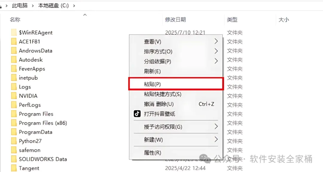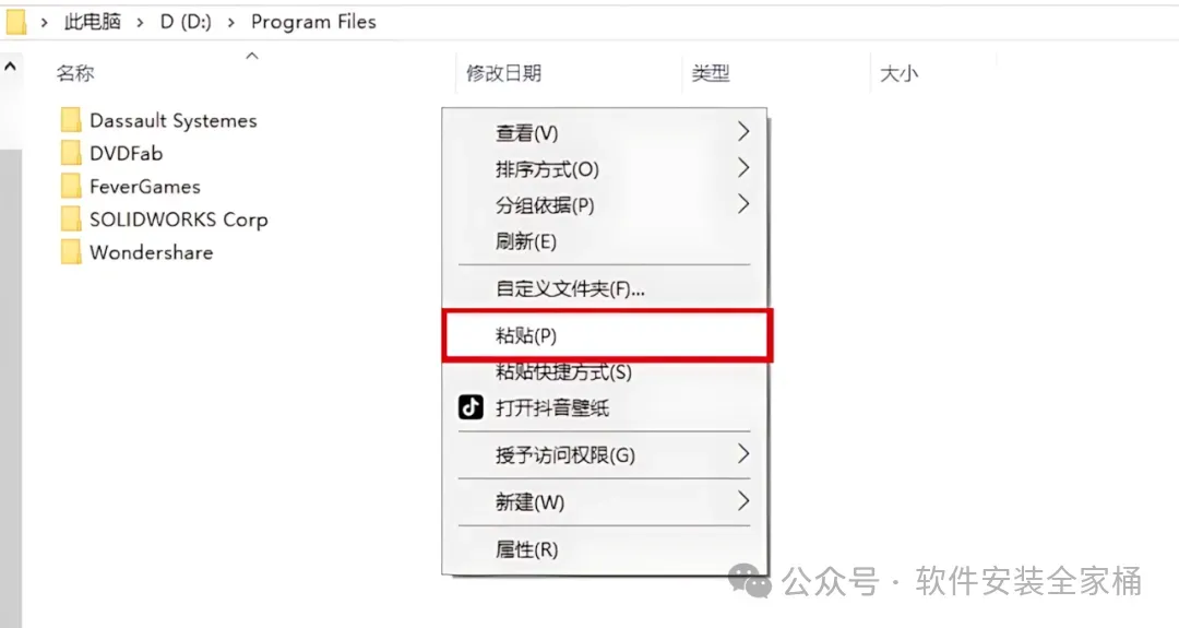 26、接下来打开软件的安装路径(参考第17步安装位置),在打开的文件夹空白处,鼠标右击选择【粘贴】刚才复制的文件。