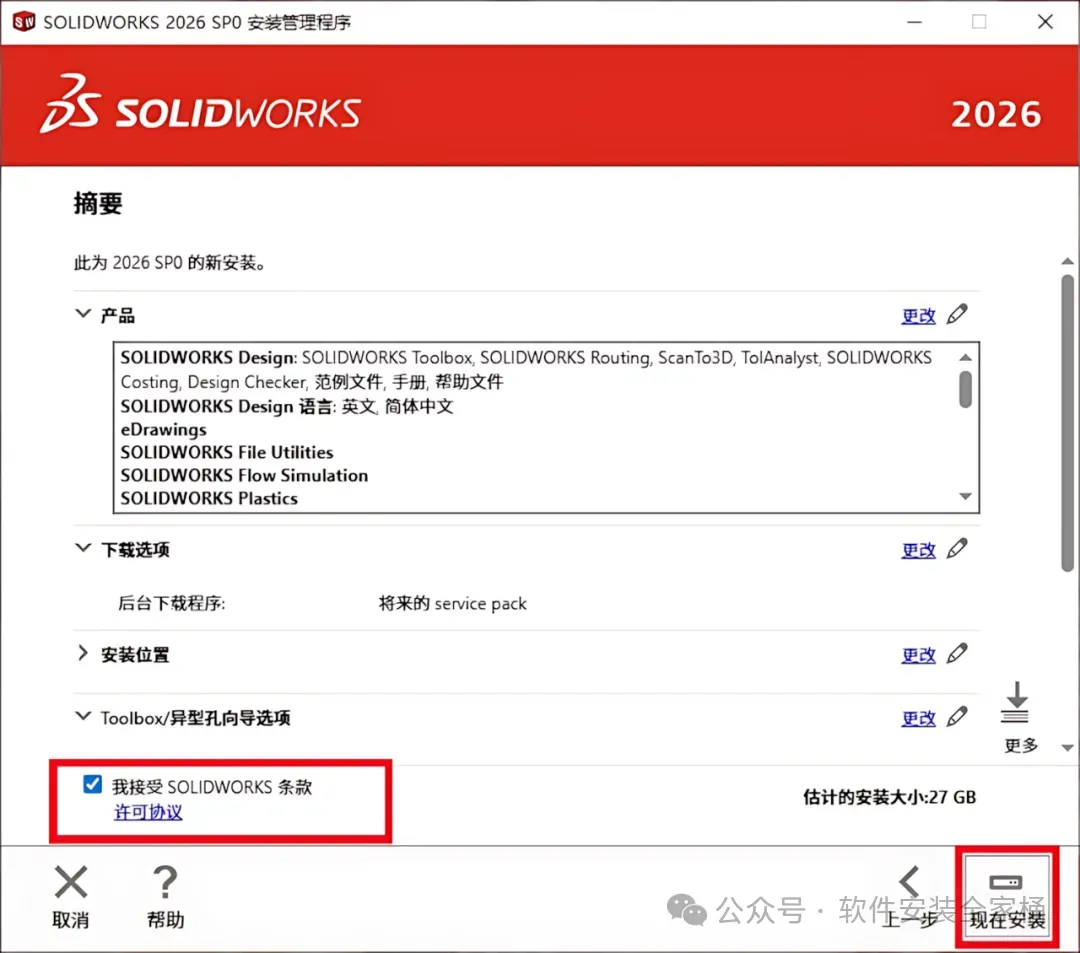 17、点击选择【我接受SOLIDWORKS条款许可协议】,然后选择点击【现在安装】。